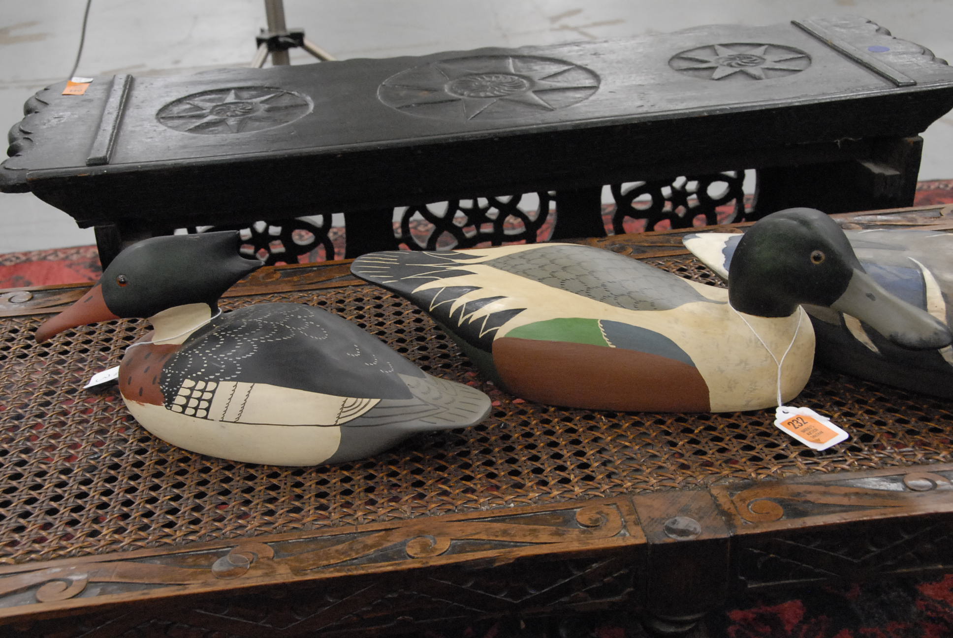Three contemporary duck decoys a shoveler Redfarms Studios, Vermont signed Bens , A Merganser, Redfarms Studios signed Kellerman and one ornamental waterfall decoys labeled AZ Crafts