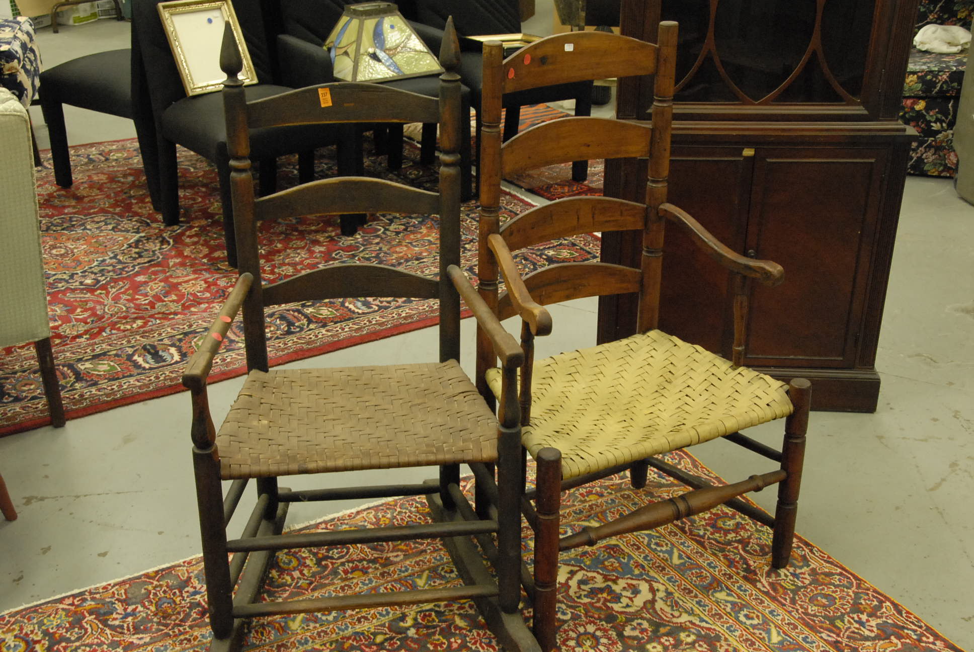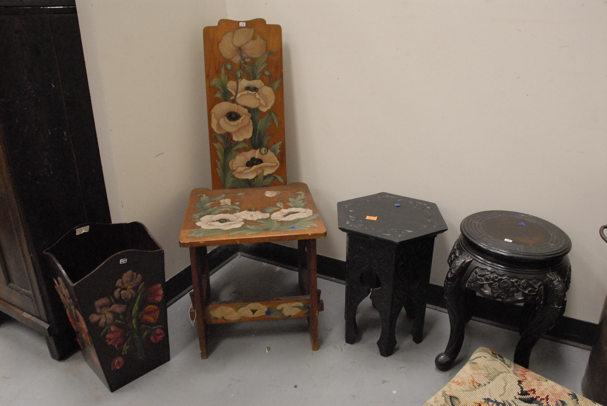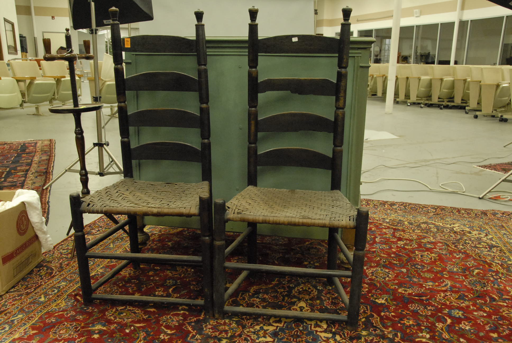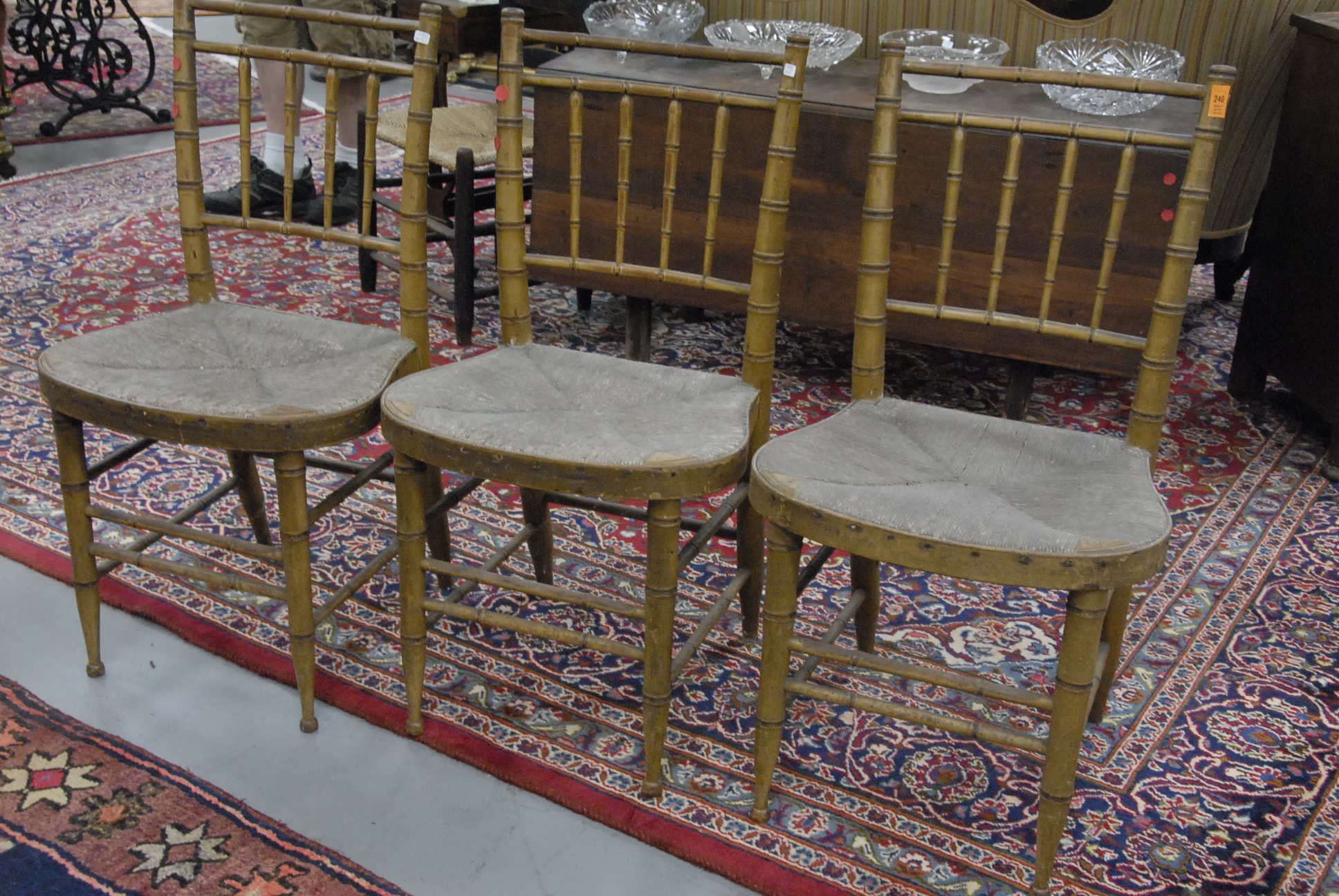 Five piece lot, a Chippendale style drop leaf table, as is, a ladder back chair, and a set of three faux bamboo Sheraton side chairs with brushed seats, 19th century