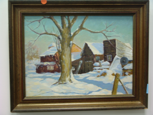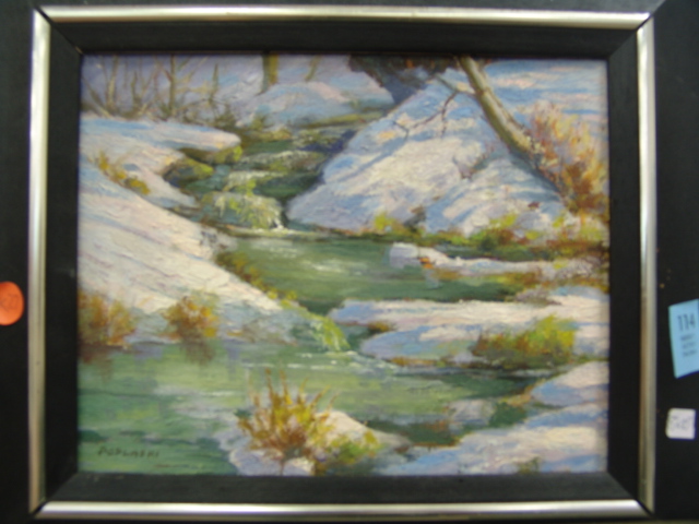 Alex Poplaski oil on board winter landscape with large tree signed lower left