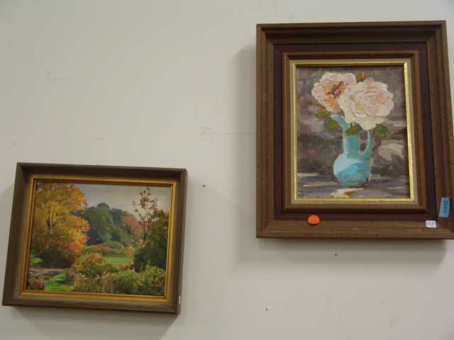 Three paintings, Alex Poplaski 1906-1988 one small fall landscape and an unsigned still life of flowers early fall landscape and landscape signed lower left