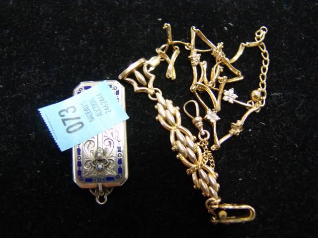 Lot including sterling silver necklace, sterling silver enameled compact and a gold watch fob