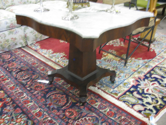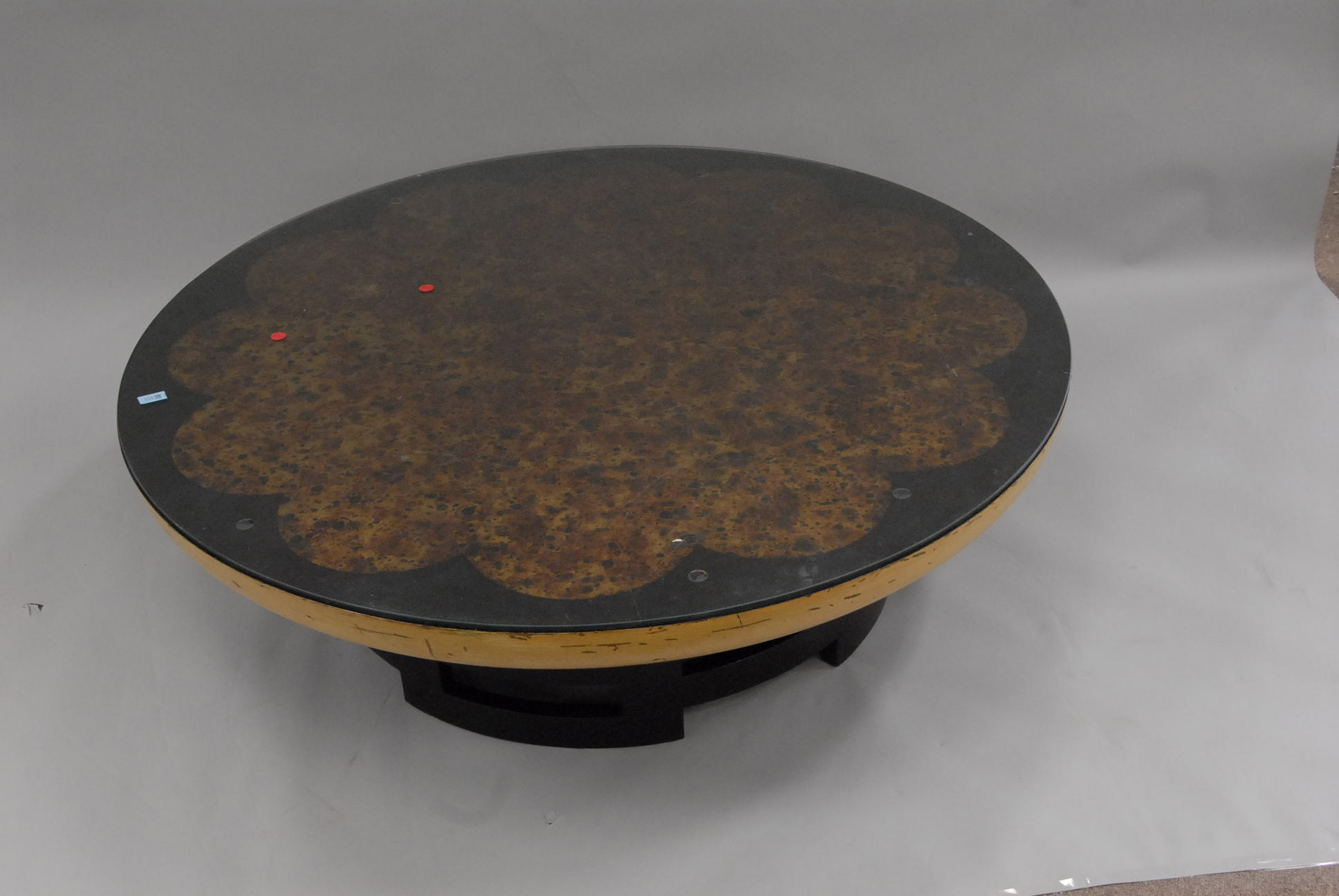 Mdern design round coffee table having glass top, part of Kittinger, label on bottom