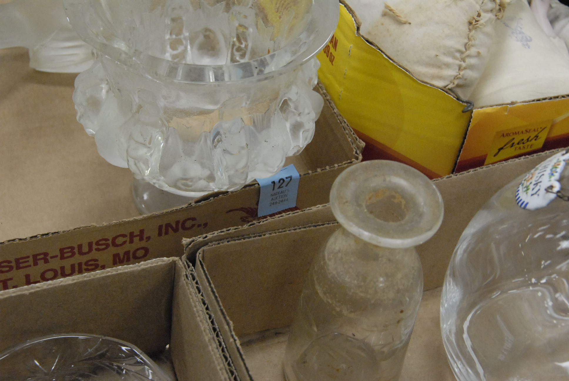 Box lot of crystal to include a Lalique vase as is Steuben cat as is Lalique bird, Steuben vase, Baccarat decanter stopper as is and a Baccarat paperweight