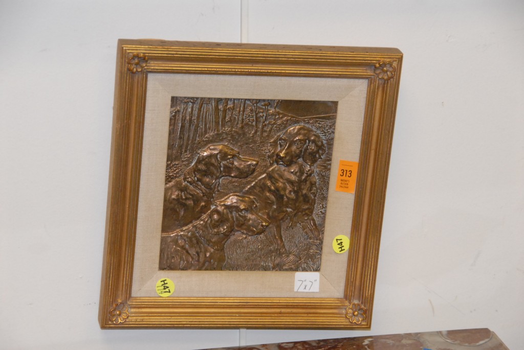 Bronze three dimensional plaque of sporting dogs.