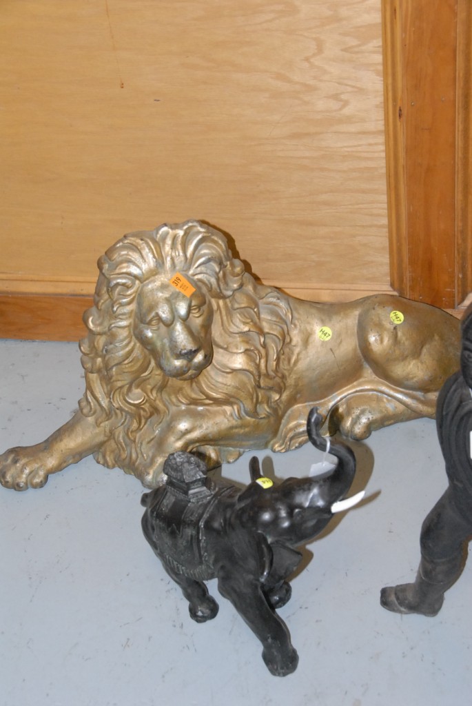 Five piece lot metal elephant, 3 metal dogs and iron lion.