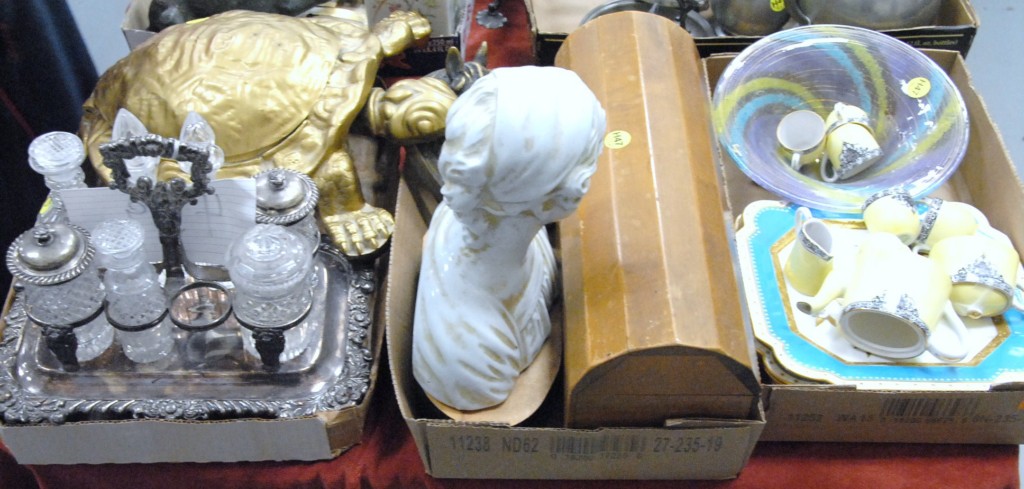Three box lots china, small teaset, cruet set, turtle, door knockers, and wooden box and some plates.