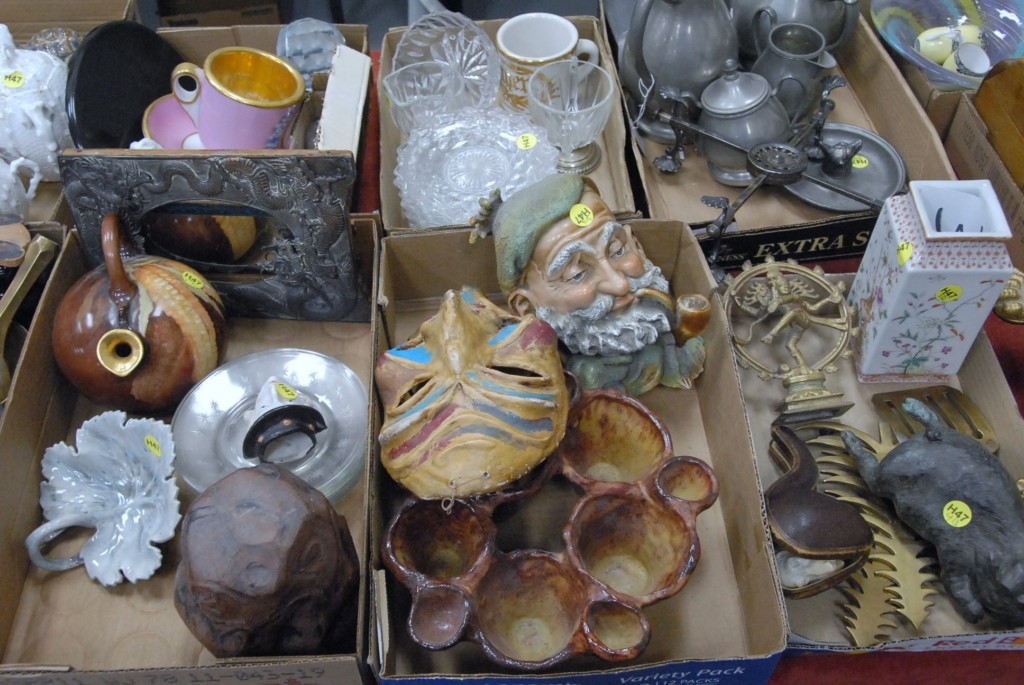 Six box lots to include pig figure, porcelain vase, pewter, glassware, two china nodders, ewer.