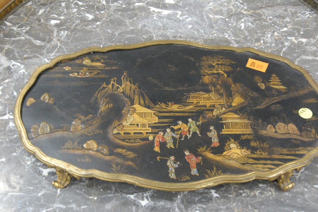 Chinoiserie decorated wooden tray with brass trim.