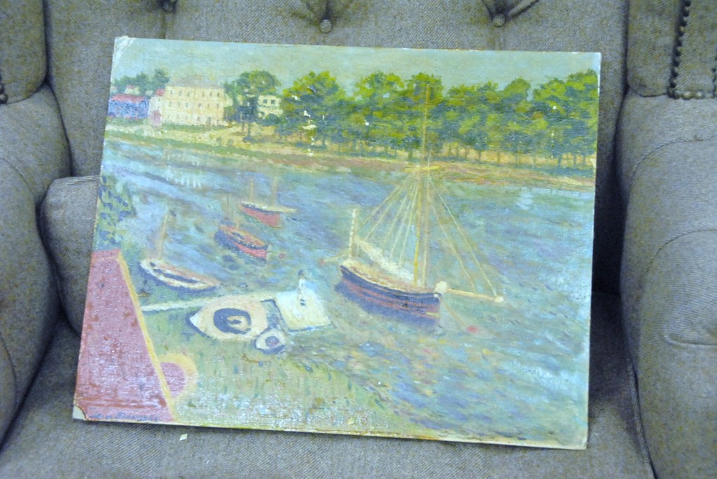Oil on board of boats in pond signed lower left Flanders.