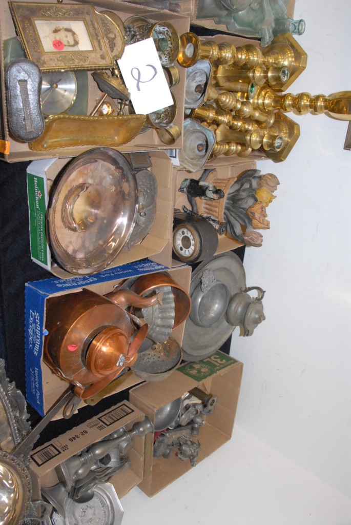Seven box lots of brass candlesticks, pewter, molds, iron doorstop, brass items, barometer, French brass frame.