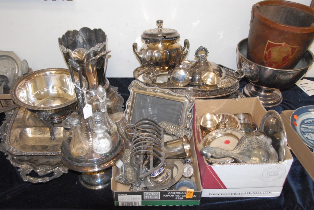 Large lot of silver plate several trays, ice bucket, punch bowl, covered dishes, cruet set.