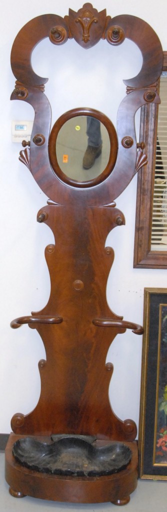 Mahogany hall rack with clam shell style iron pan in bottom.