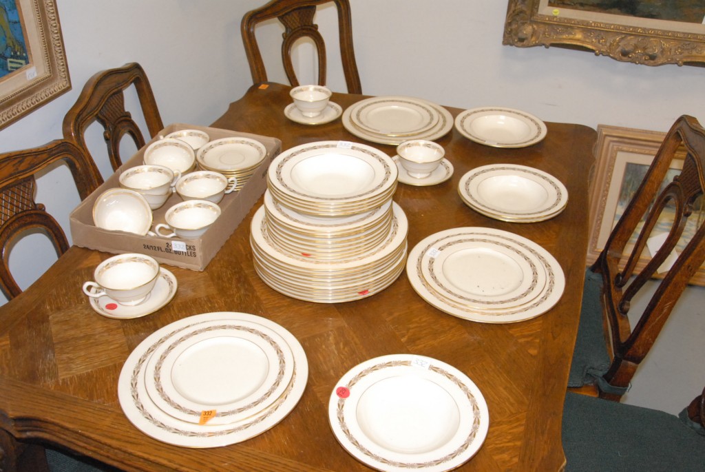 Set of gold wreath pattern Lenox china cups, saucers, plates 2 sizes and bowls.