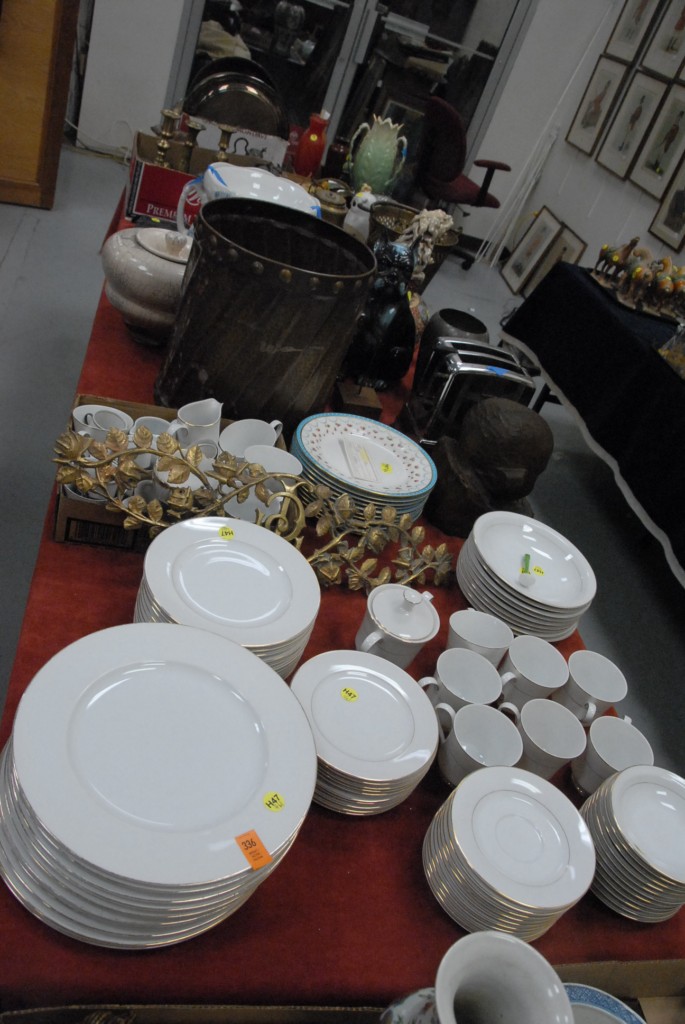 Table lot of china including plates marked Baily, Banks, and Biddle, brass candlesticks, slop bucket, brass pieces, art glass vases, owl light.