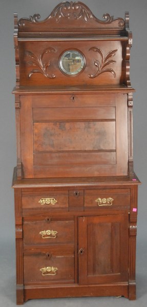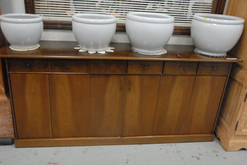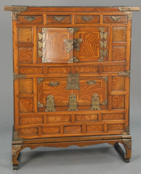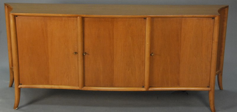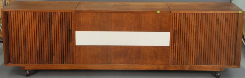 Milo Baughman for Directional ‘Country Villa’ chollection chest of cherry and myrtle burl having six linear drawers above two bi-fold doors which conceal a fitted interior of drawers and pull out shelves, marked Directional with a metal plaque in drawer, circa 1962, very good condition, ht. 34in. lg. 80in.