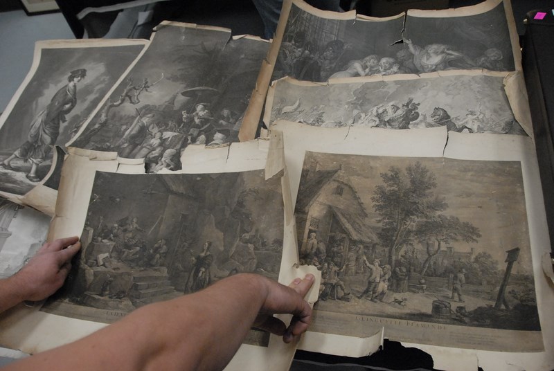 Seven engravings to include two David Teiers, Jacques Philippe LeBas Latentation De Antoine and Guinguette Flamande, Thomas Burke 1749-1815 Crazy Kate, The Quack Doctor Le Charlatan, T. Cook after Hogarth And the Child Grew, P.W. Tomkins after Brown The Final Interview…, and one other unsigned.