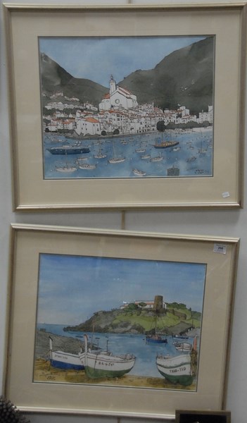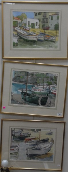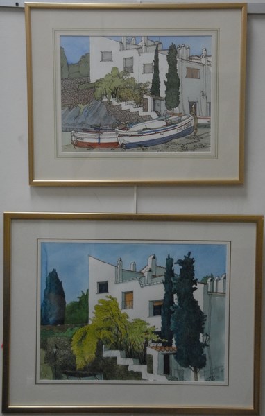 Three watercolor paintings by Raymond Allen Jackson 1927-1997 House of Salvador Dali Port Lligat 1996, Salvador Dali’s House Port Lligat 1988, and Povoa de Vauzin Portugal 88, signed lower right Jak, 12 x 15 1/2, 12 x 15 1/2, and 14 3/4 x 19 3/4.