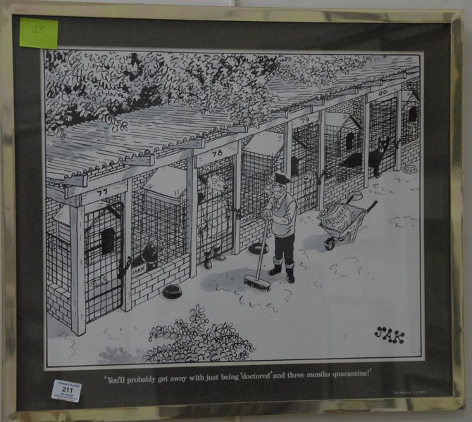 Raymond Allen Jackson 1927-1997 watercolor and ink You’ll Probably Get Away With Just Being Doctored and Three Month’s Quarantine from the Standard 9/3/1983 signed lower right JAK, sight size 17 1/2 x 21 3/4.