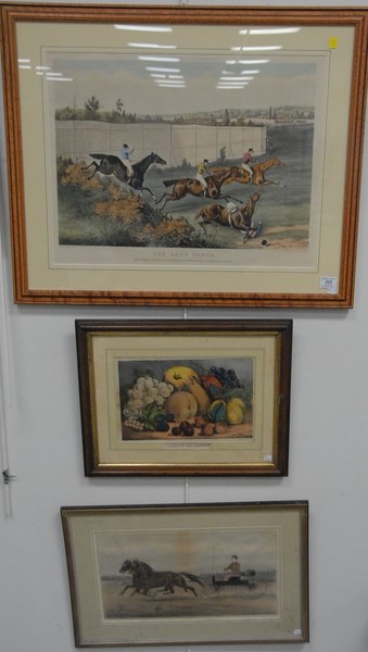 Group of three framed items to include The Last Fence lithograph after H. Alken Steeple Chasing Illustrations, Currier & Ives Fruits of the Season, and watercolor of a horse race.