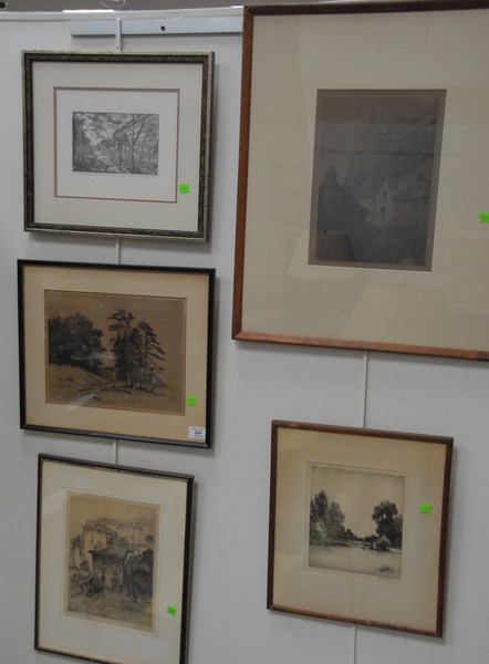 Group of four etchings and a print including Thiola D’Aocenzo etching Old Church Burzoa signed lower right Thiola D’Aocenzo, Charles Forget 1886-1960 etching of French castle pencil signed lower right Ch Forget, John Gullaford etching The Shames of Shepportion, Etching of house initialed lower left L.G. 9 1/4 x 12 1/4, and one print.
