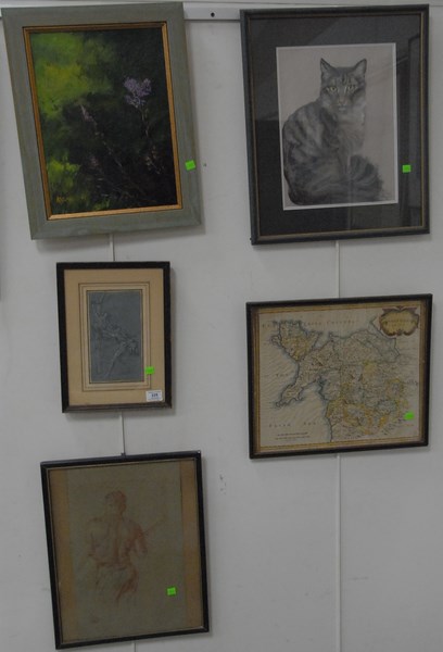 Group of seven paintings and maps to include Robert Morden North Wales, St. Georges Channel or the Irish Sea, watercolor of crashing waves, French drawing The Devil’s Tail, and black and white chalk on blue paper, etc.