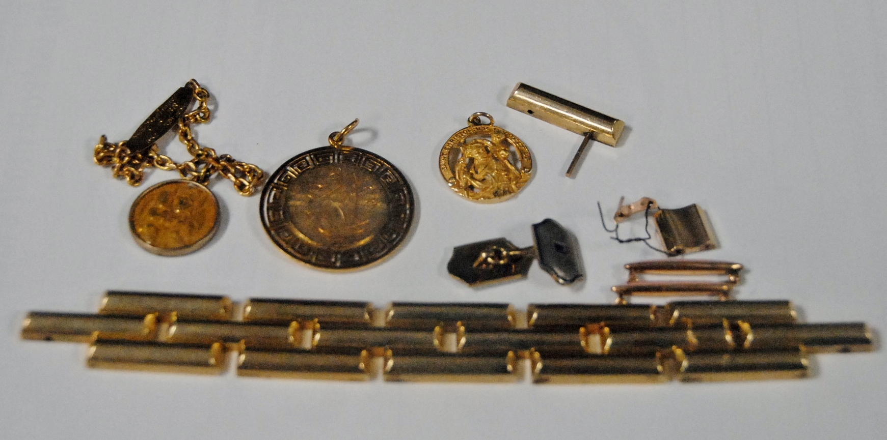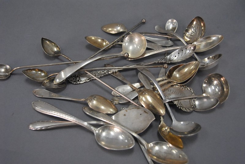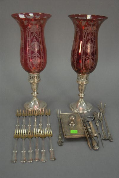 Group lot of sterling to include a pair of sterling candlesticks with ruby glass shades, set of sterling cocktail forks, bottle opener, miscellaneous sterling serving pieces, and desk set, 9 t. oz of weighable silver.