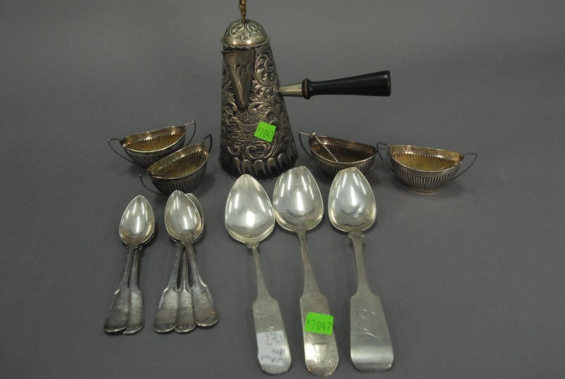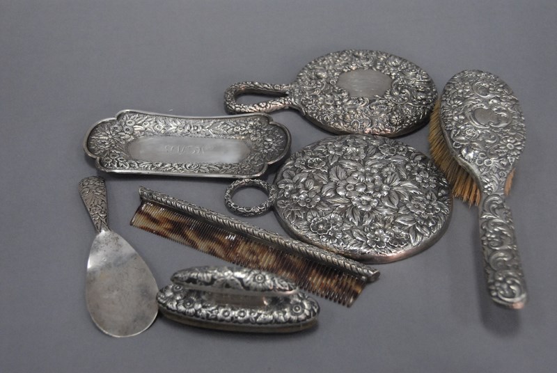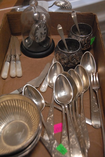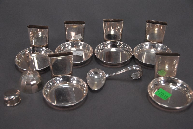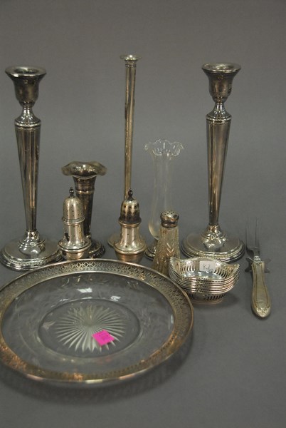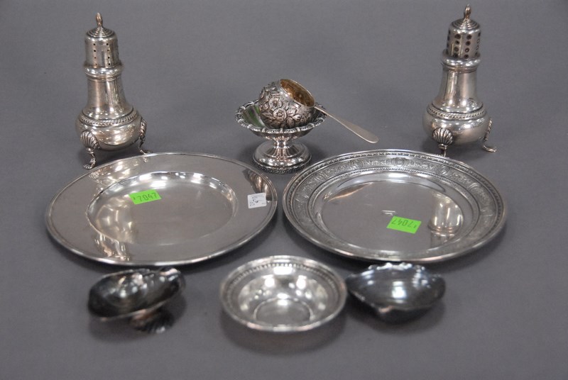 Group of eight sterling nut dishes, salt and pepper along with group of eight weighted sterling pieces including pair of candlesticks, plate, vases, etc., 8.2 t oz. weighable silver.