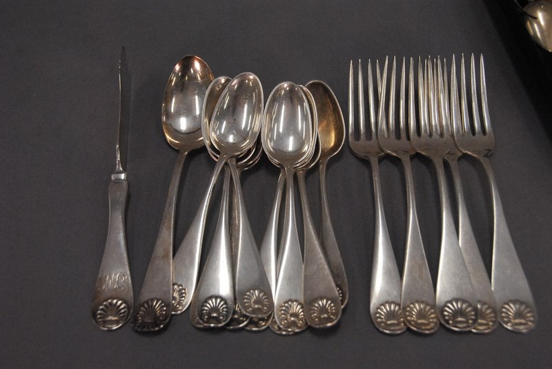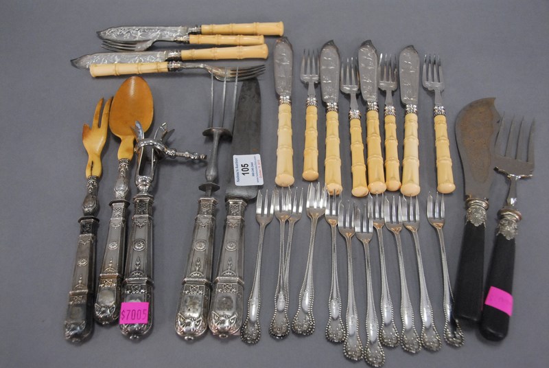 Group of sterling to include five piece serving set, two piece fish set, set of six knives and forks, fish set with ivory handles, and group of sterling cocktail forks, 5.2 t oz. weighable silver.