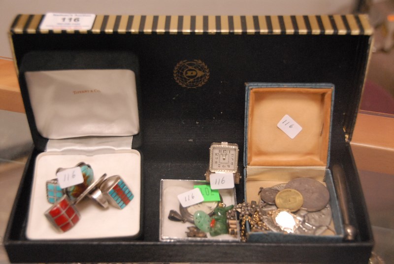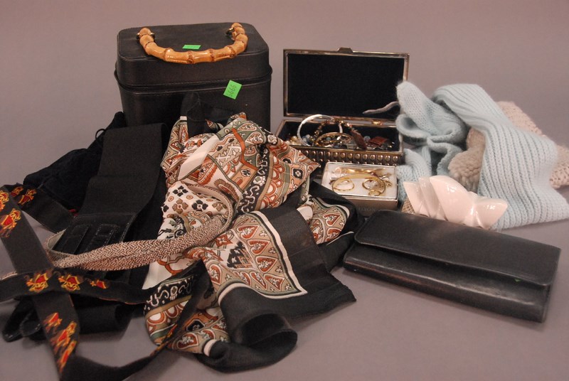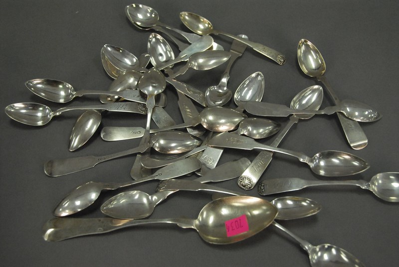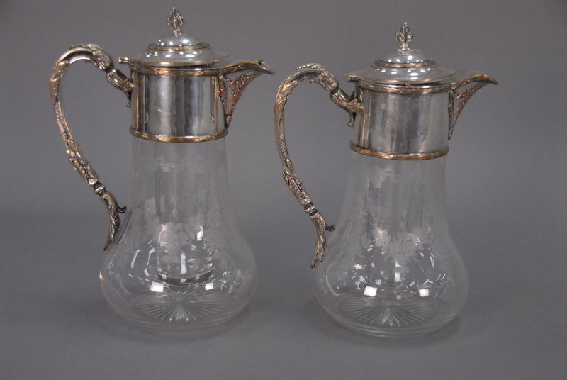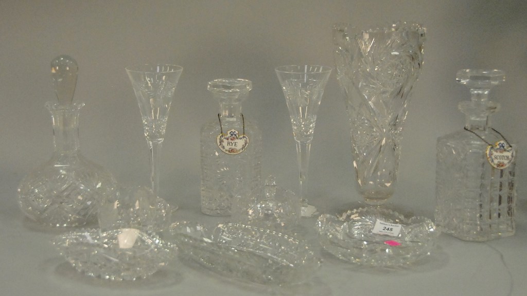 Group of cut glass and crystal to include pair of Waterford stems, three decanters, large vase, and five small pieces along with a group of weighted sterling and silverplated items.