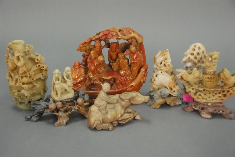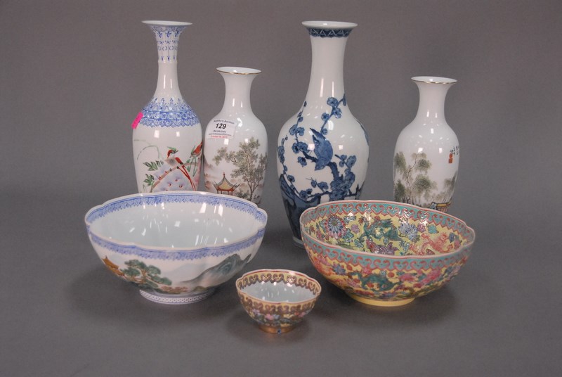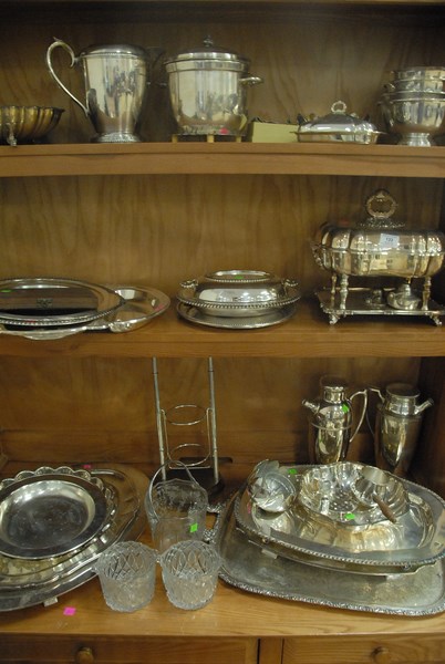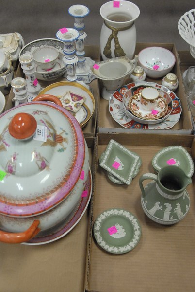 Four box lots to include large reproduction export style covered tureen and underplate, six pieces of Wedgwood, two pairs of candlesticks, export cup and gravy, etc.