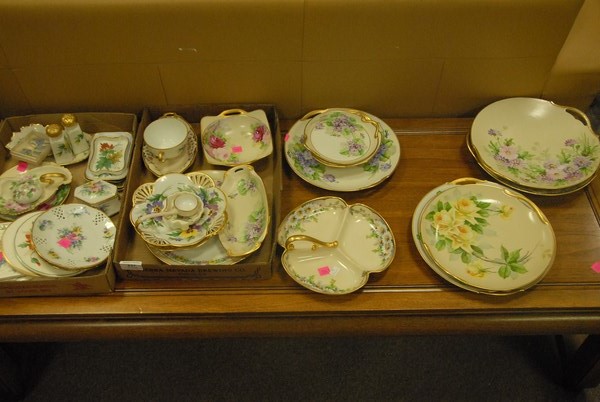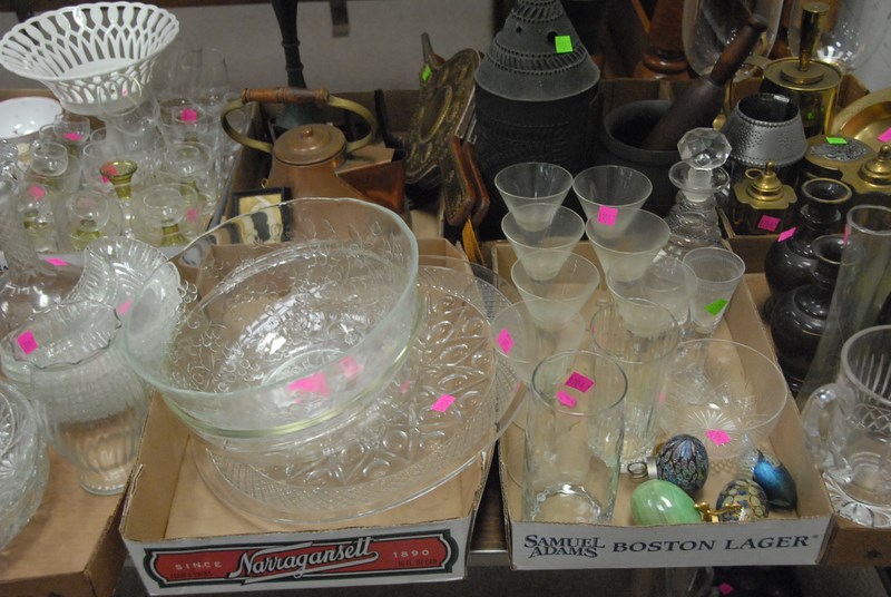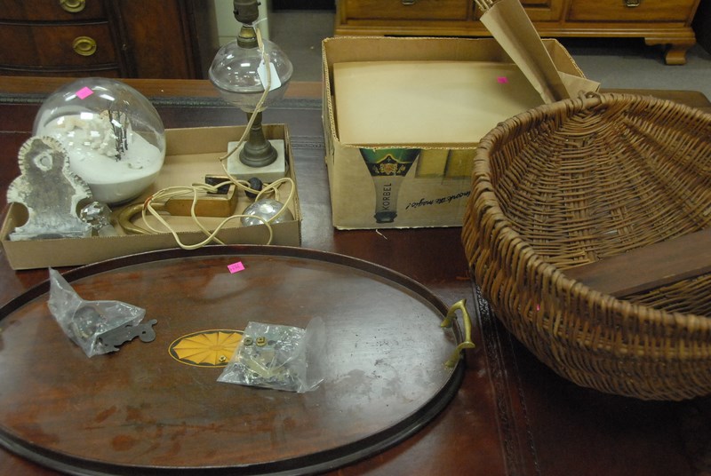 Lot to include three Italian painting books, glass ball with sand and shell etc., whale oil lamp, brass hook, tole match holder, mahogany tray, and oval basket.