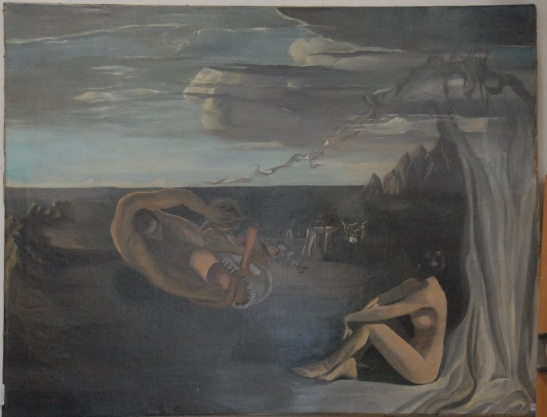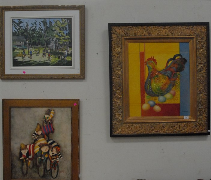 Three piece lot to include two contemporary oil on canvas paintings Riding Bikes signed I. Roybal 23 1/2 x 19 1/2 and Chicken signed L 23 1/2 x 19 1/2 along with Robert Roy 1957 oil on masonite Volleyball signed lower left R. Roy 6 x 19 1/2