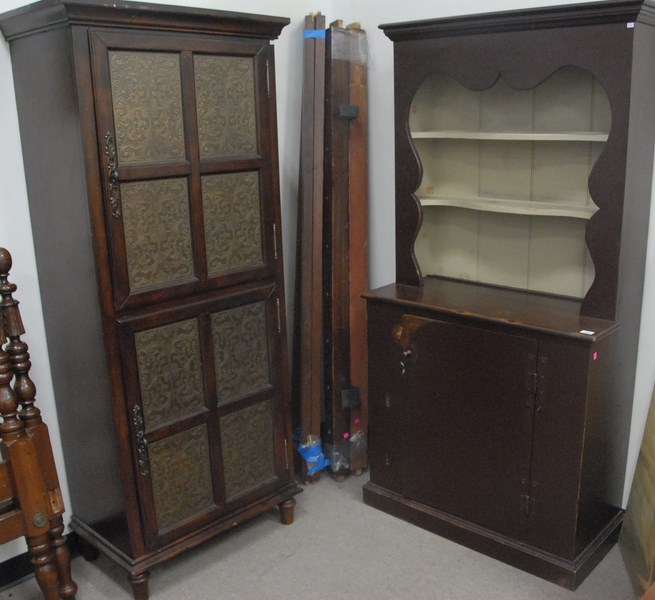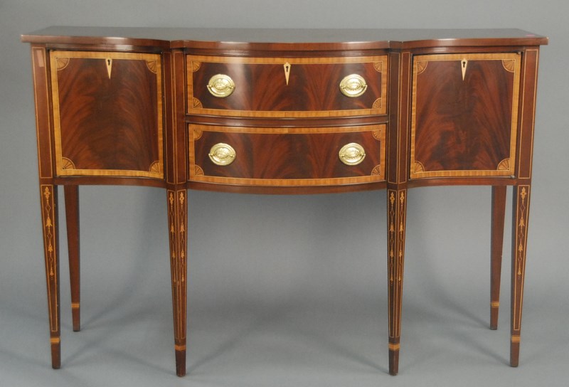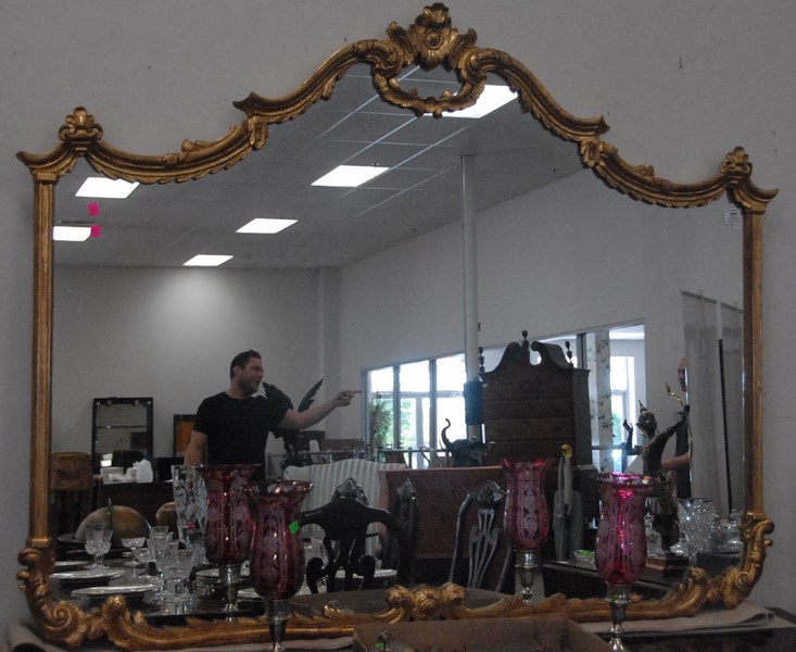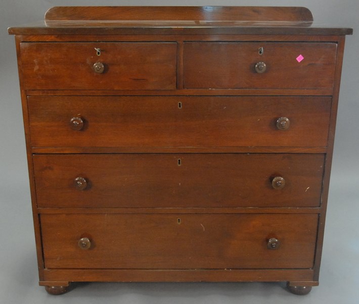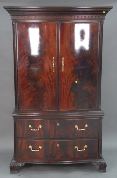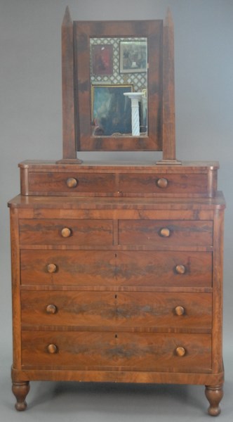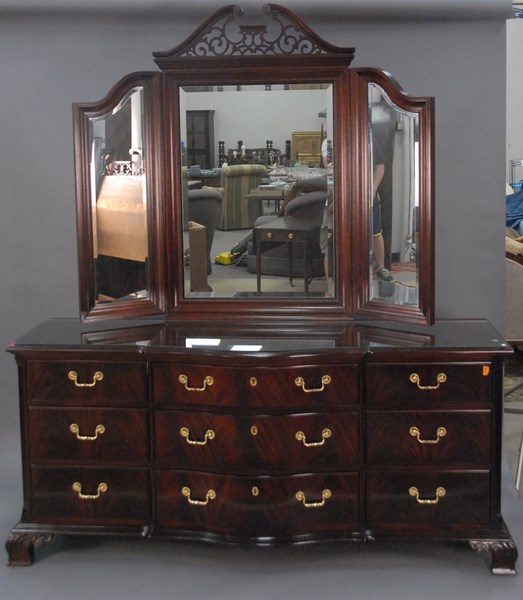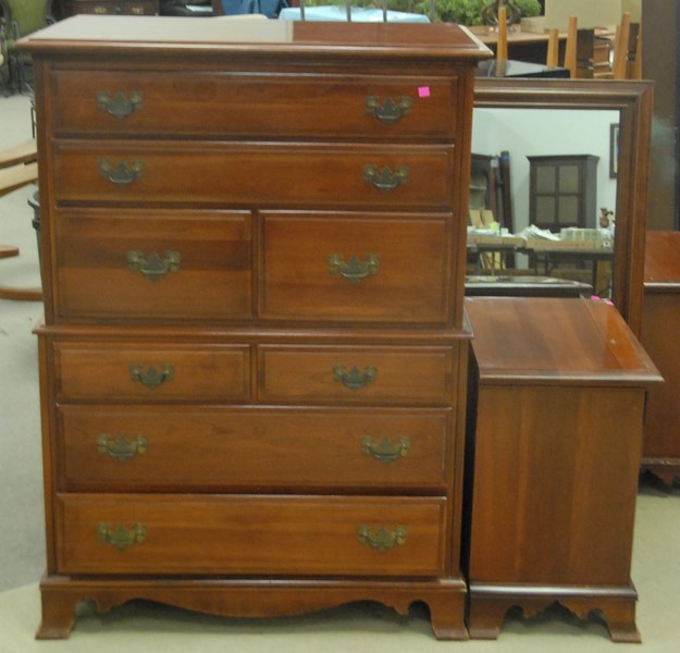 Thomasville mahogany bedroom suite with king size four post bed, triple chest and mirror, and tall chest, tall chest: ht. 70in. wd. 43 1/2in. dp. 18in., bed: ht. 89in.