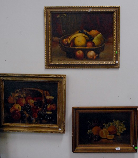 Three still life paintings of fruit, signed, to include Giovanni Castano 1896-1978 oil on canvas 21 x 17 signed lower left, Nellie Lincoln oil on canvas 12 x 17 1/2 signed lower left, and M. Weber oil on board 15 x 19 signed lower right.
