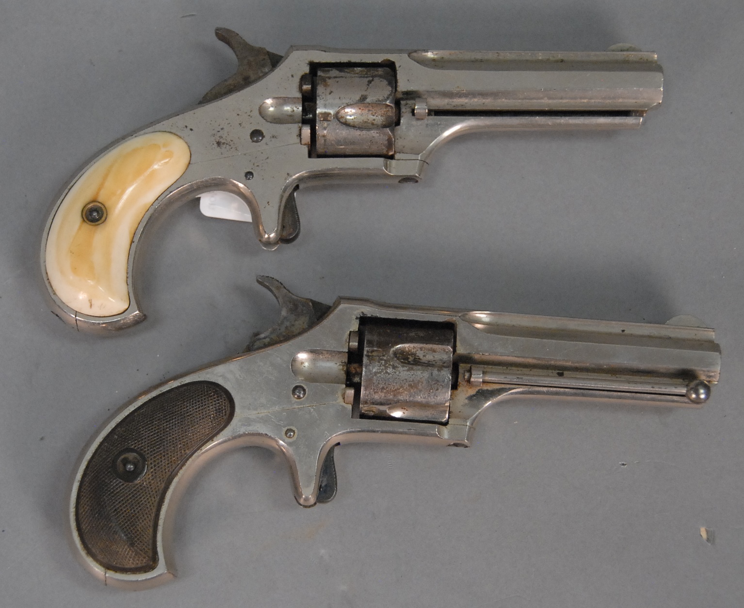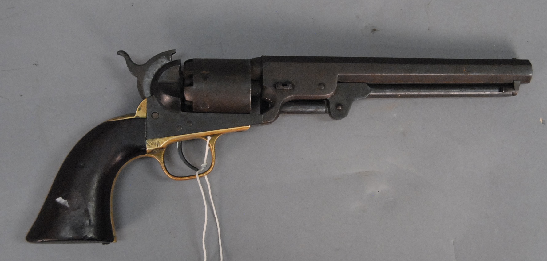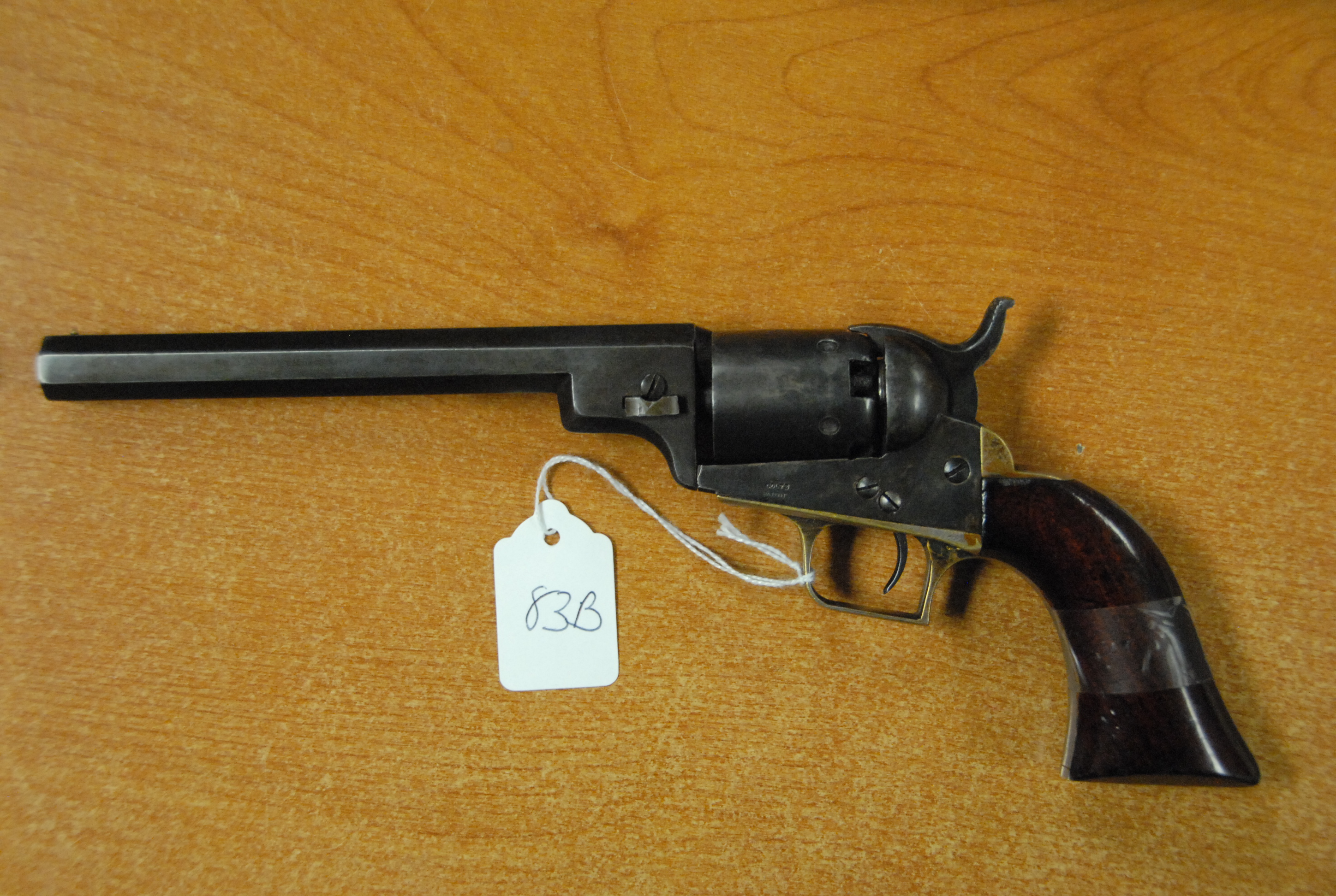 Exceptional example of a rare Colt 1848 pocket Baby Dragoon percussion revolver, this is a full size Baby Dragoon Revolver, different from the later full size dragoon 1849 model in that this has square back trigger guard and oval cylinder stops, top of the octagon barrel marked Address Saml Colt New York City, s/n 6547.