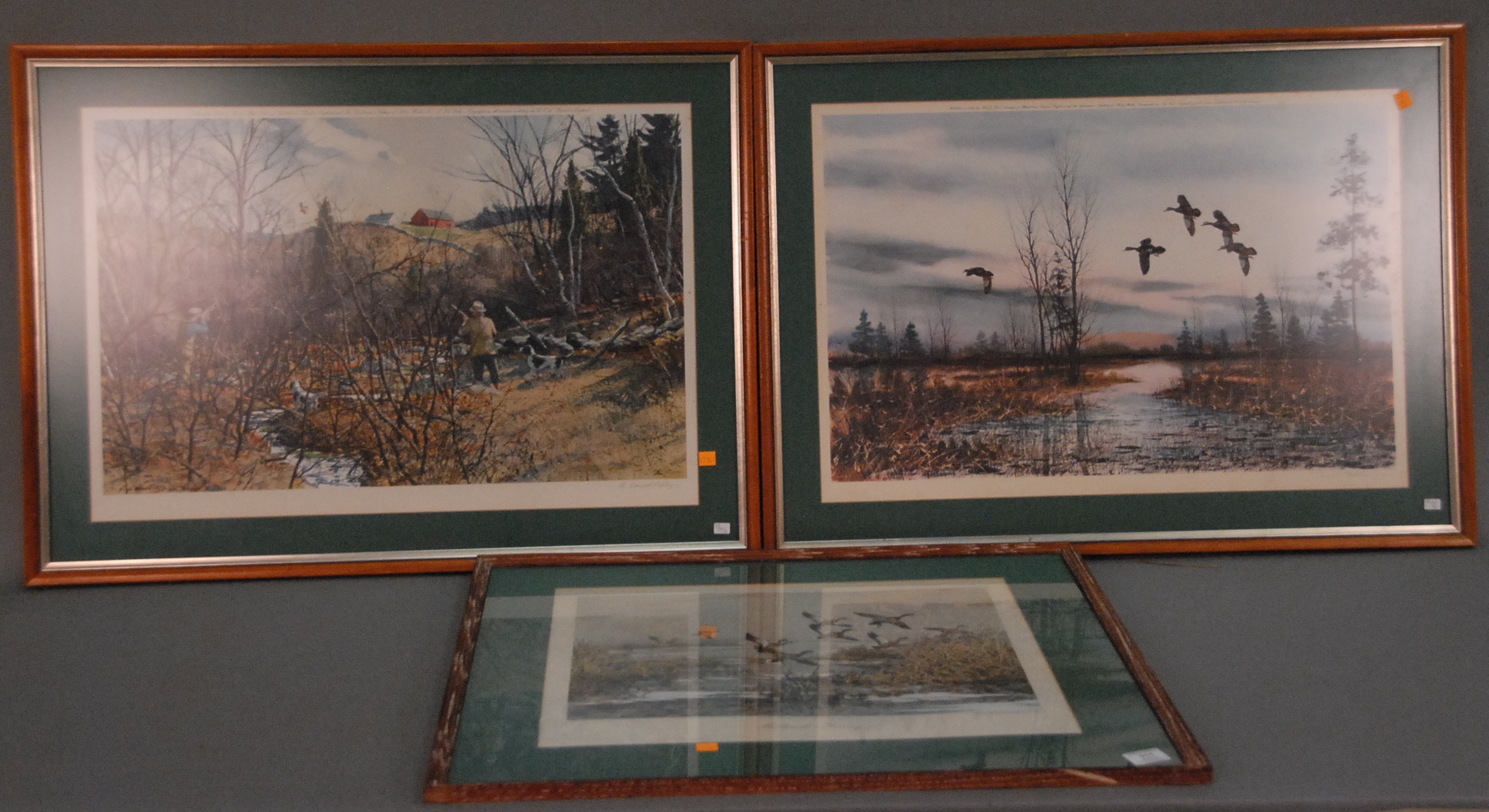 Three pencil signed sporting prints including Aiden Lassell Ripley 1896-1969 print hunting woodcock 26 1/2 x 17, Roland Clark Mallards Rising 18 x 13 1/2, and David Hagerbaumer 1921 27 x 17.