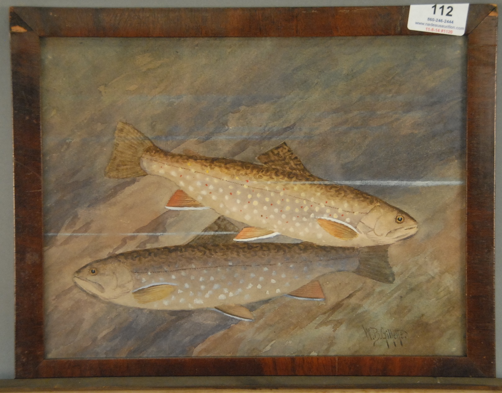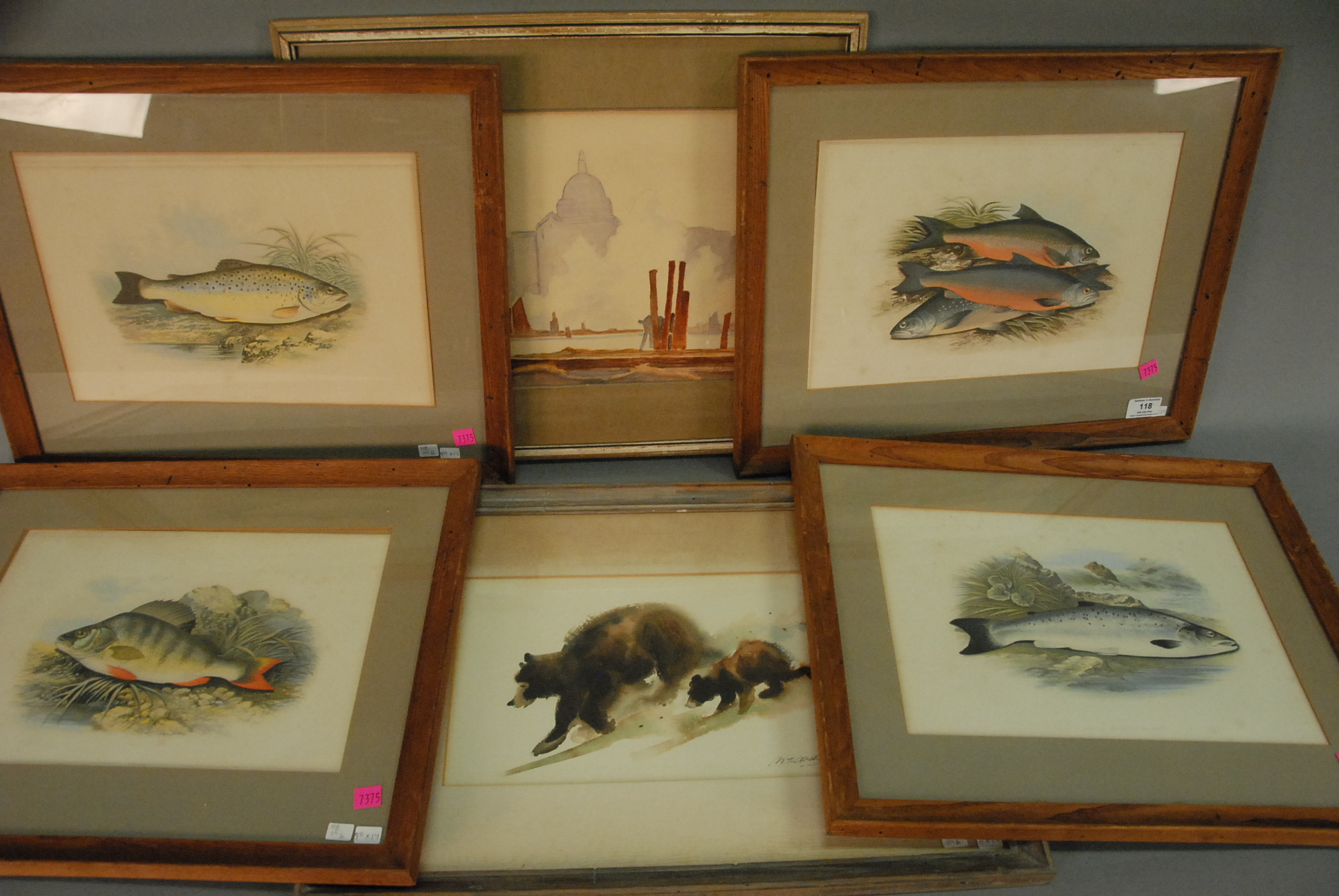 Six piece lot to include set of four fish prints including Salmon, Char, Perch, and Trout, a watercolor of bears signed indistinctly, and watercolor signed Broadhurst.