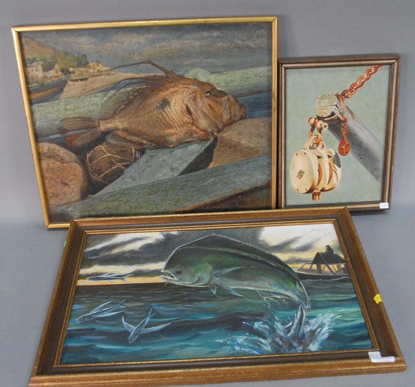 Three paintings to include Tim Eastland 20th/21st Century JUMPING MAHI MAHI oil on board and G. Francini TODAY’S CATCH oil on board and oil on board of pulley