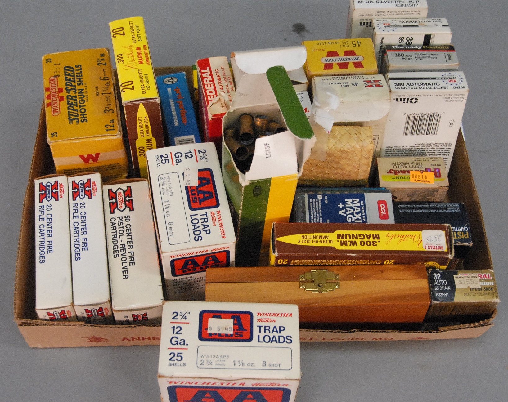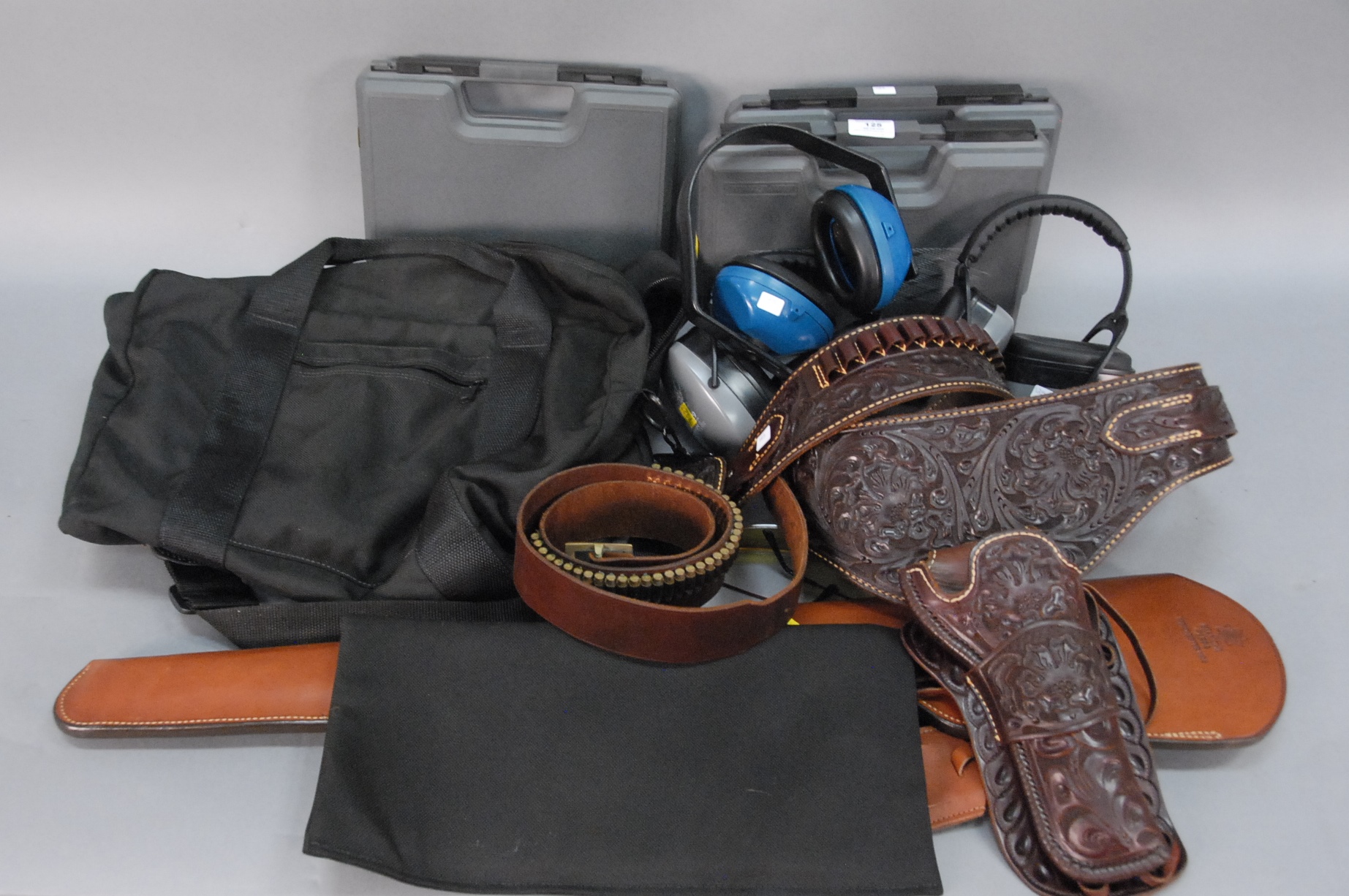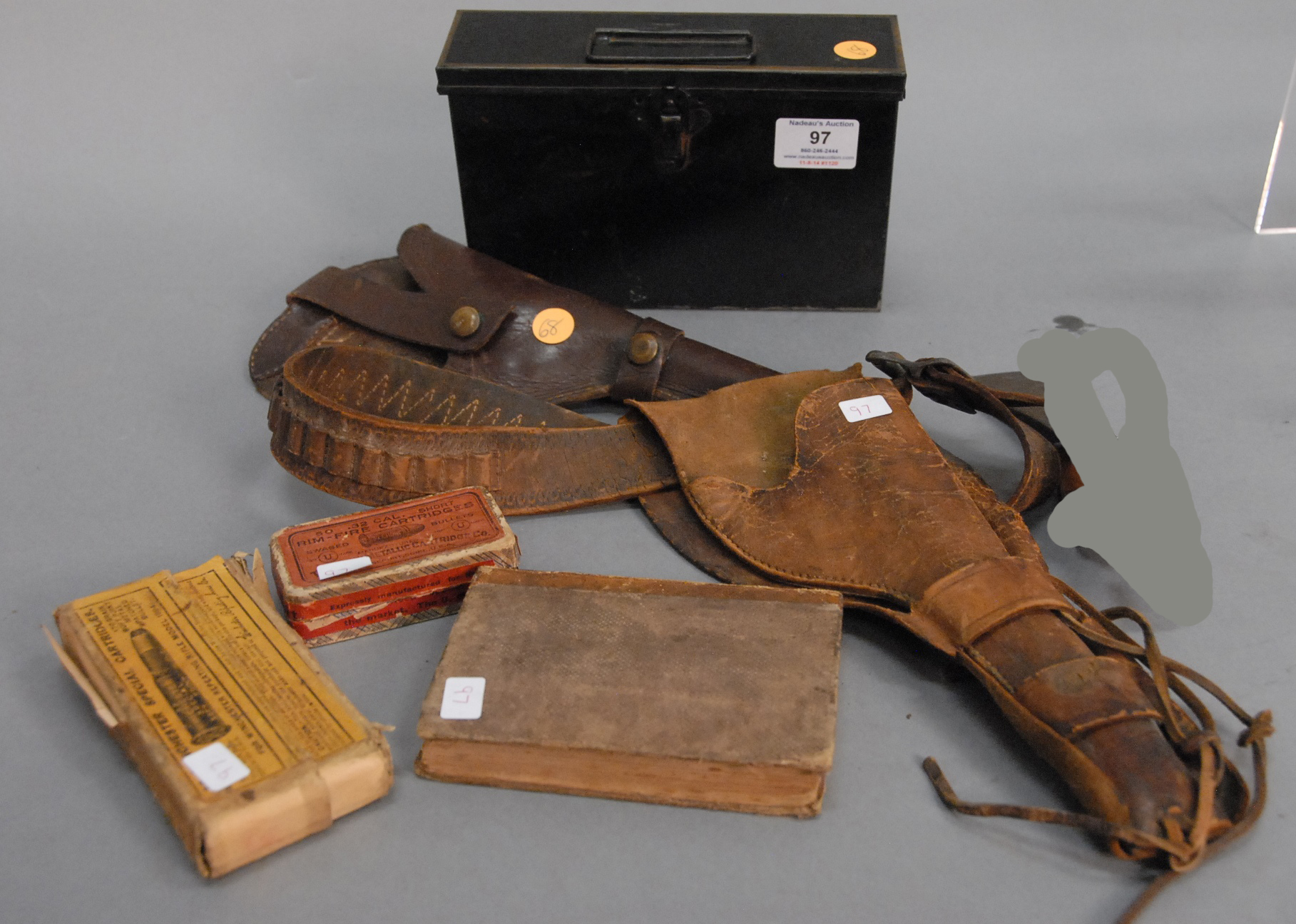 Group lot to include two vintage bullet ammo boxes, a 1861 book Rifles Light Infantry Tactics, two Civil War leather holsters, and a metal medical doctor’s kit.