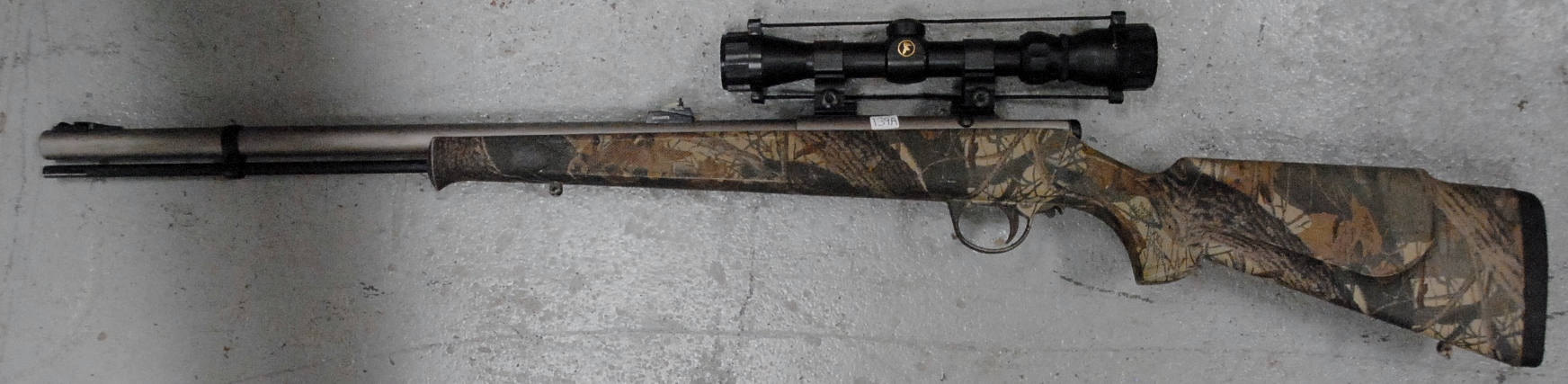 In-line muzzle loader, CVA, Connecticut Valley Arms, Firebolt, 50 cal. black powder rifle, appears new no box, Tasco scope 2×7 with covers, 1:32 twist, Weaver see through bases, fiber optic iron sights, camouflage plastic stock with Monty Carlo cheek piece, 24 barrel.