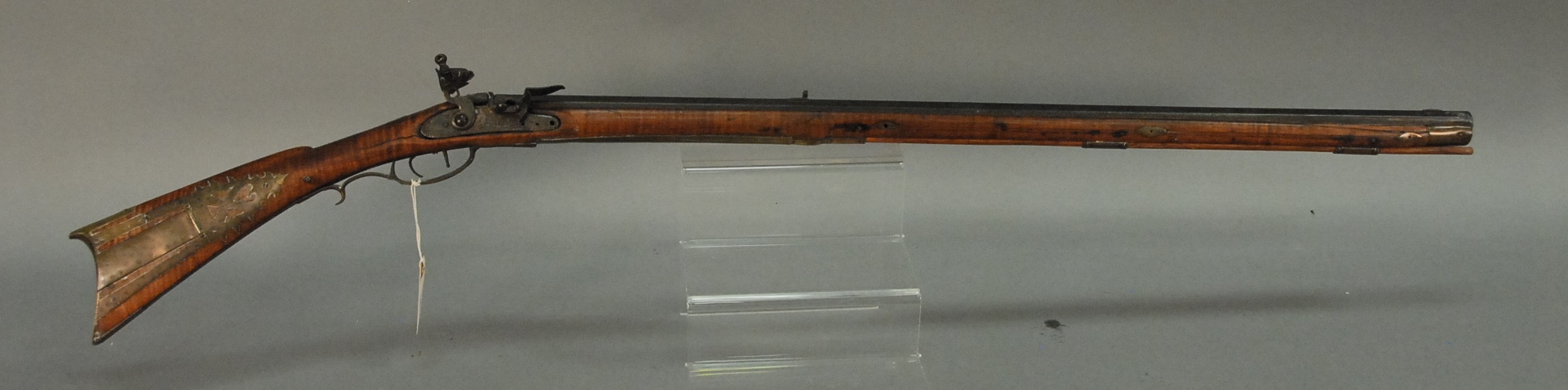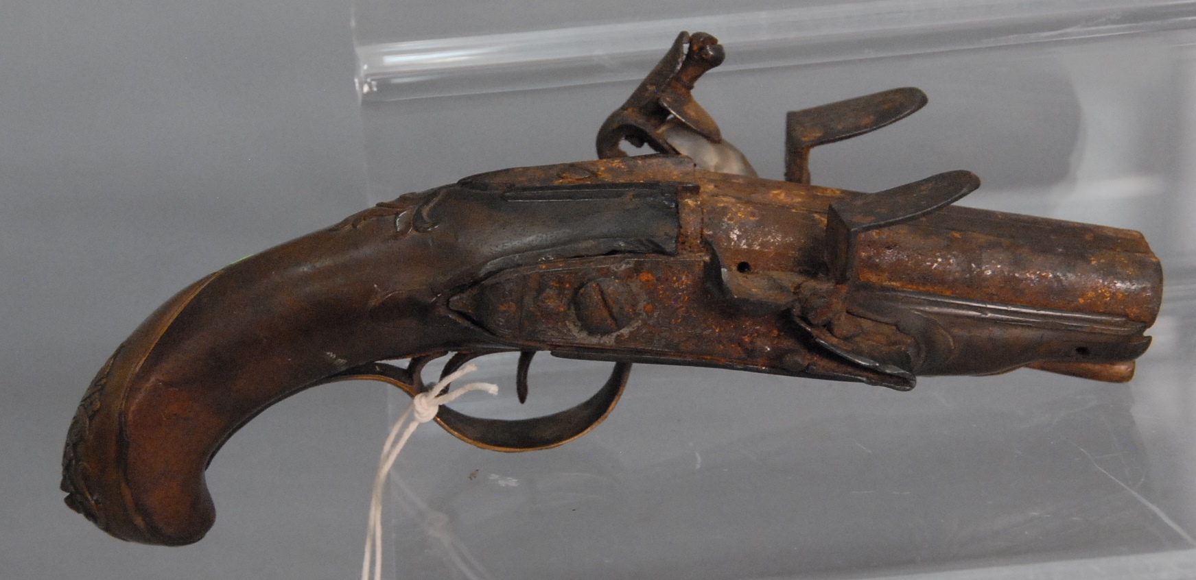 Horn Flintlock double barrel pistol, very rare Flintlock having carved horn stock and grip, silver plated lock sides and a brass trigger guard, no marks and rough condition.