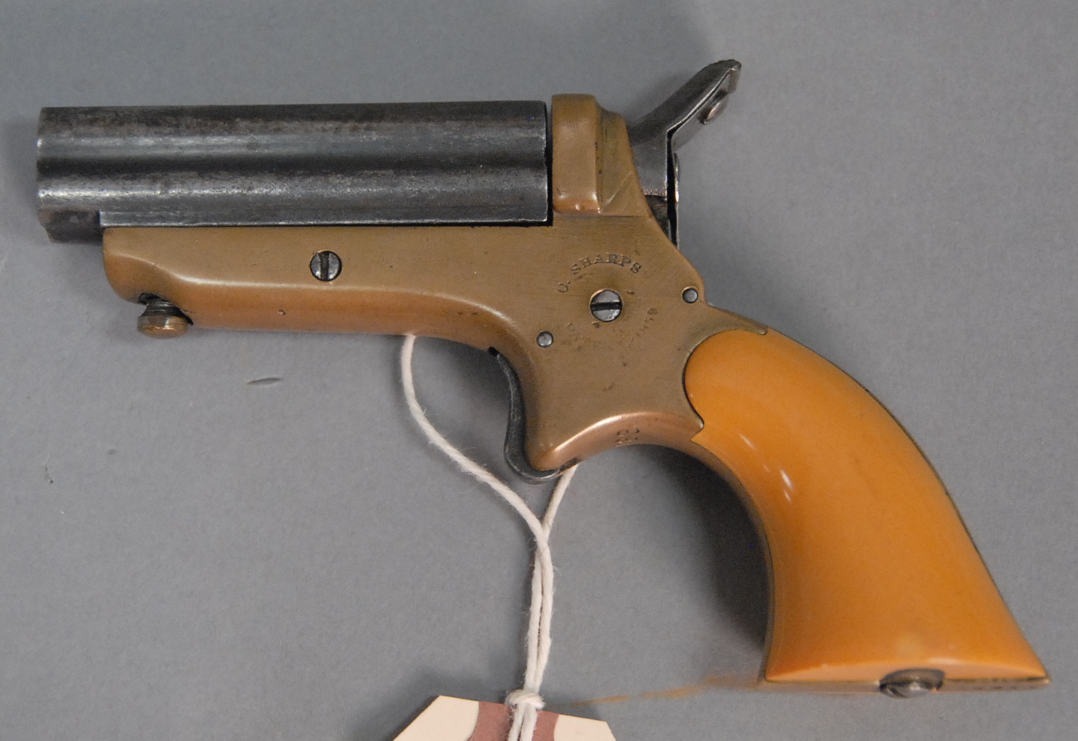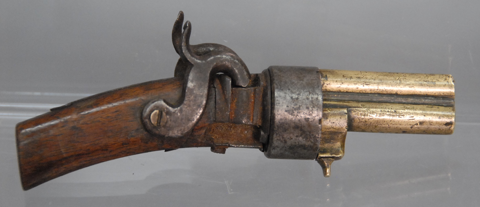 Percussion double barrel, purse or pocket revolver having two hammers with double brass barrels marked on top, 5 shot on revolver and single shot center barrel, 1 1/2 barrels.