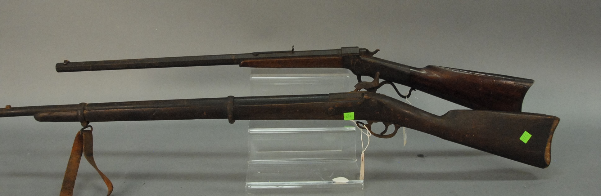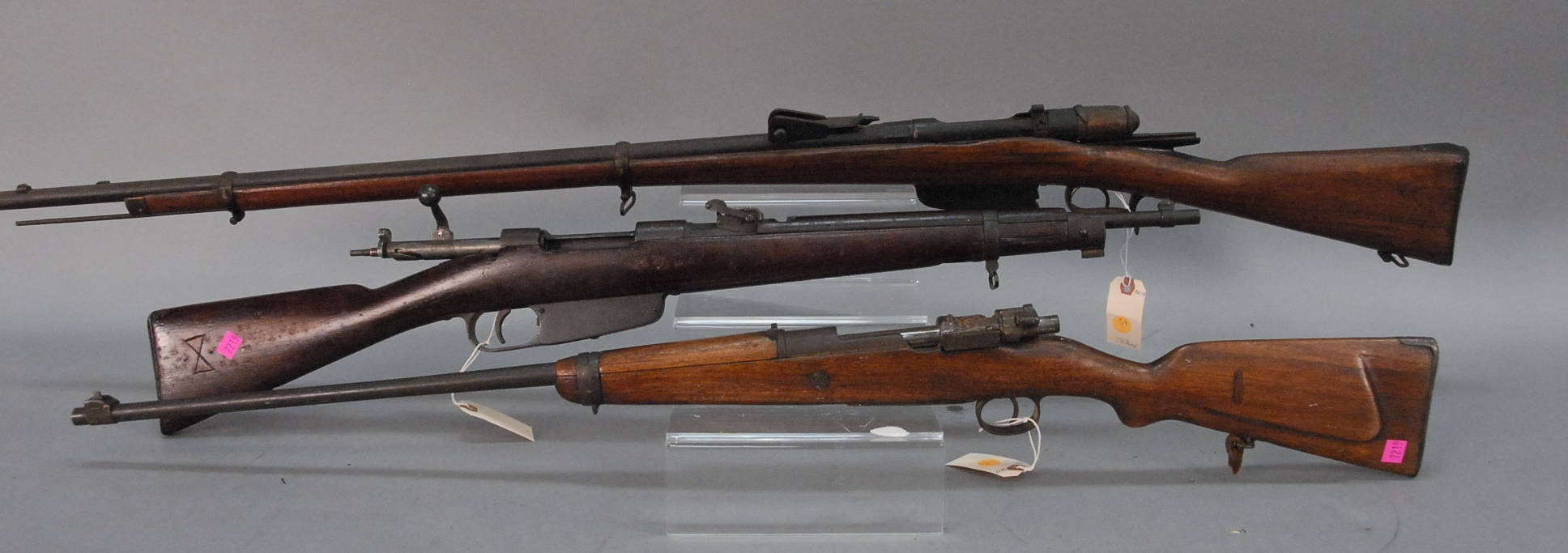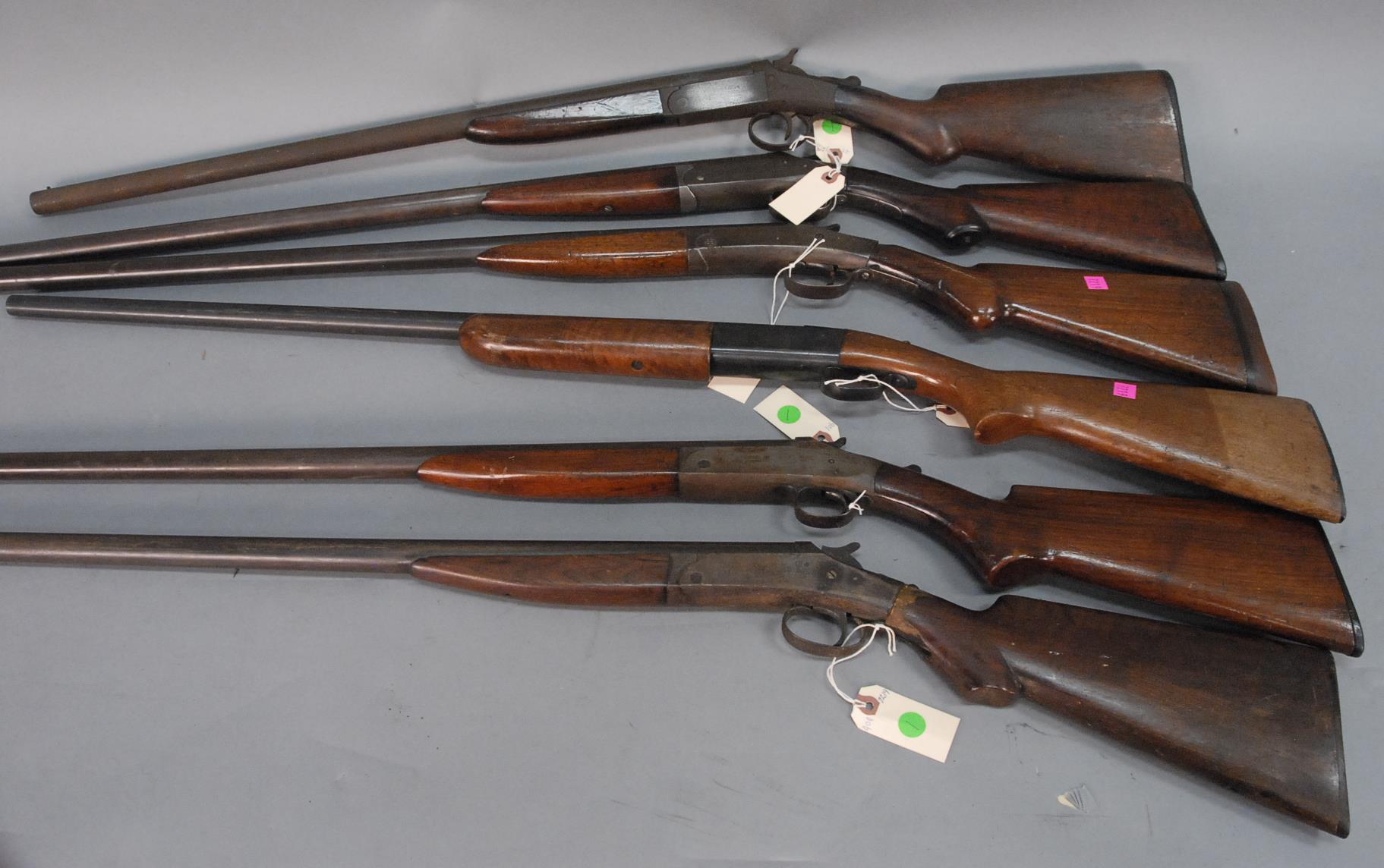 Group of six shotguns to include Harrington and Richardson model 1900, single shot, 12 gauge shotgun, 29 7/8 barrel, s/n 117472 two Crescent Firearms Co. shotguns, 12 gauge, single shot, model New Victor Genuine Armory Steel, made in Norwich, CT having 30 barrels, s/n 67334 & s/n 70332 Hopkins Allen Arms Co. shotgun, 12 gauge Diadem, 27 7/8 barrel, single shot, s/n F3889 John M. Smyth shotgun, model 1900, 12 gauge, s/n Z846- and Winchester shotgun, 16 gauge, model 37 with 28 barrel, no s/n 401, 402, 403, 404, 405, & 406.