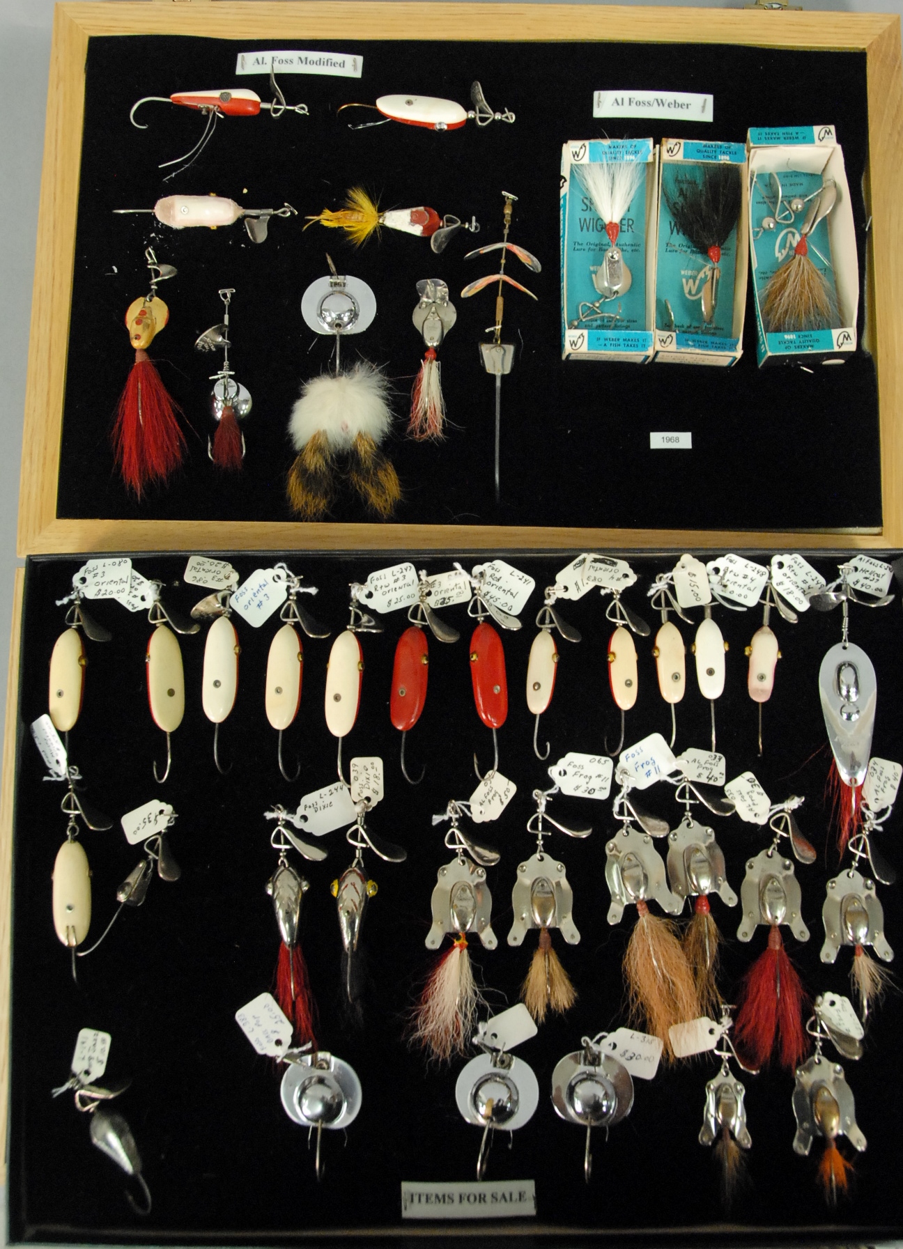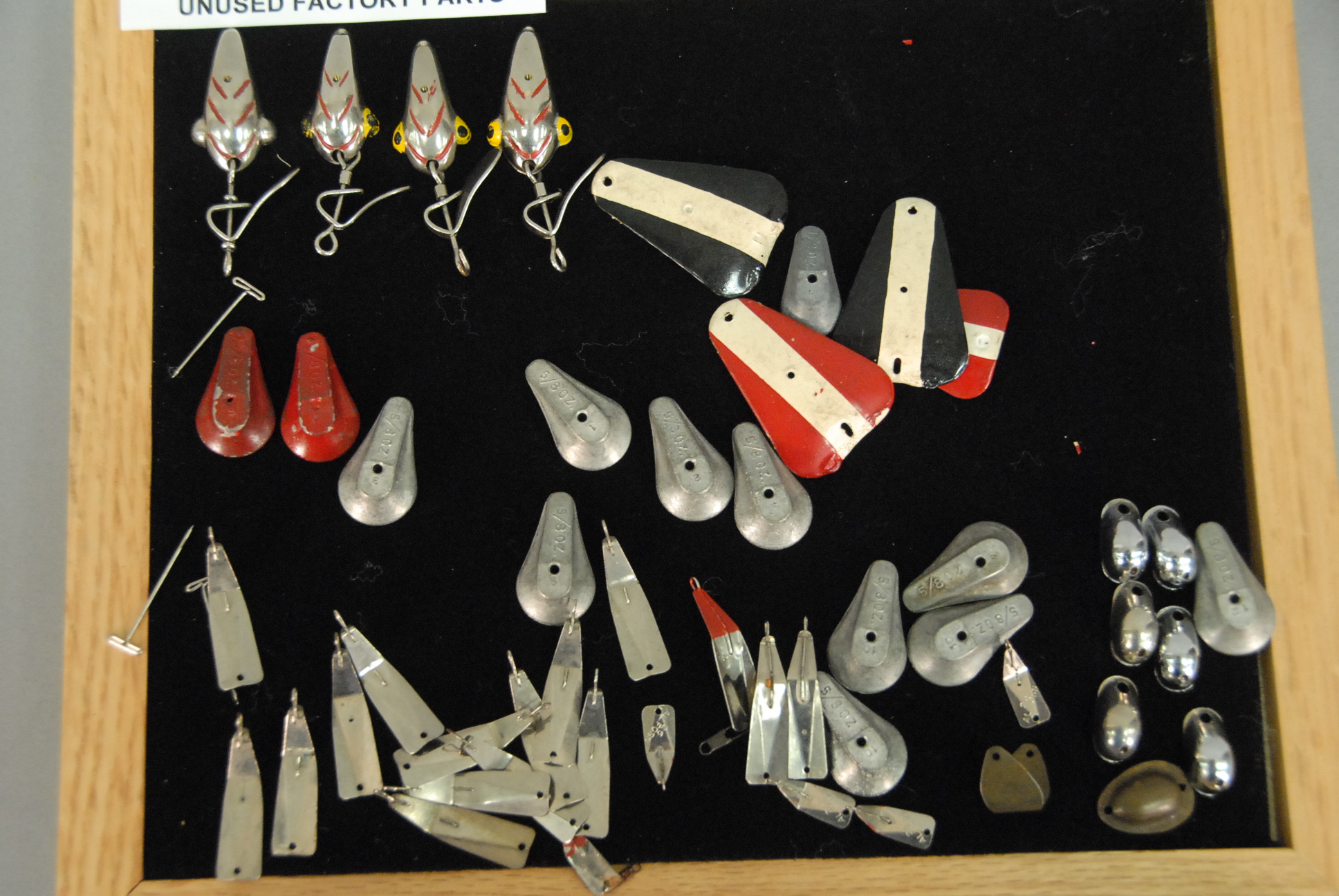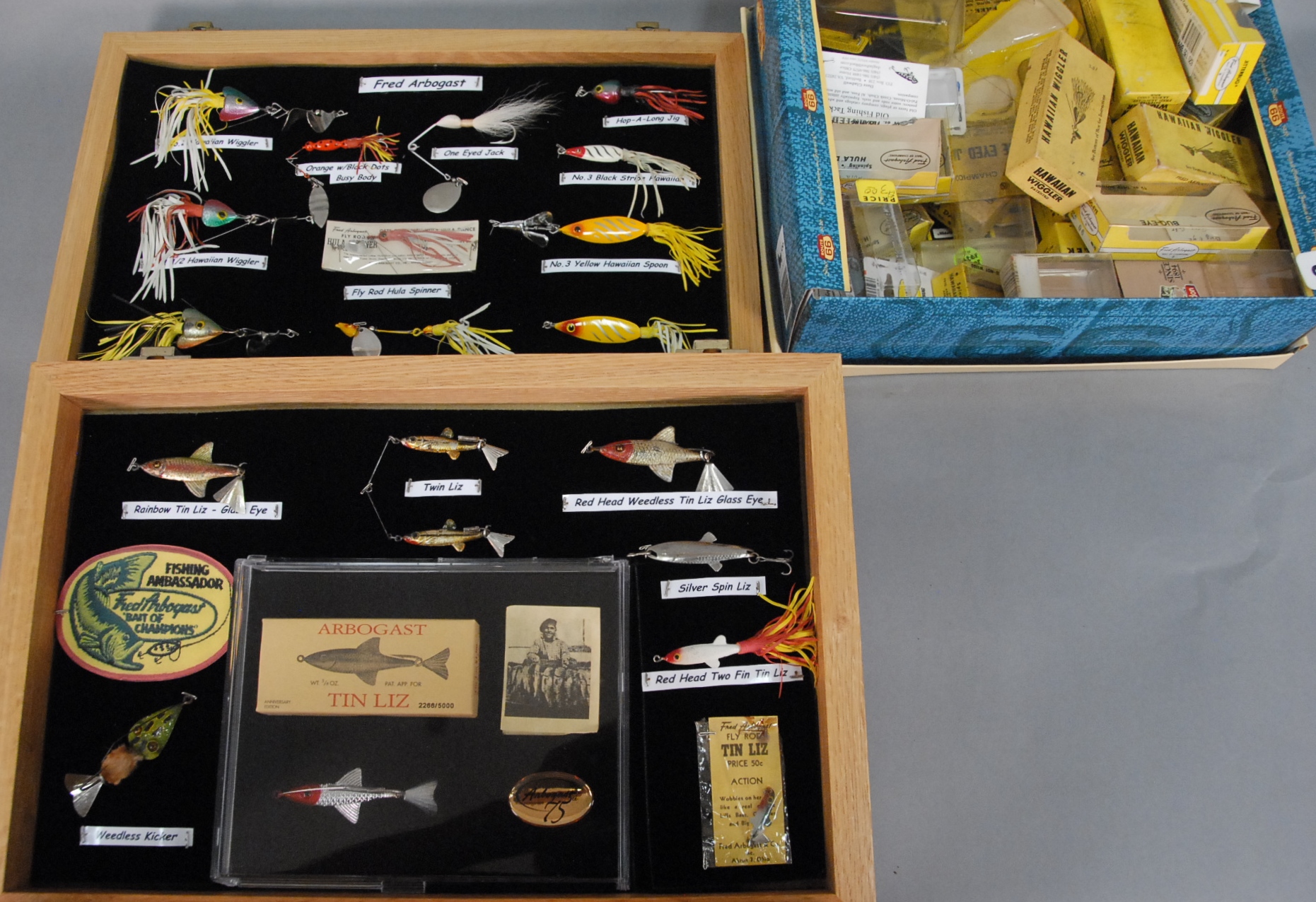 Fred Arbogast, two cases with eight tin lures including Rainbow Tin Liz with glass eye, Twin Liz, Red Head Weedless Tin Liz, Weedless Kicker, Fly Rod Tin Liz, eleven Wigglers, spoons, jigs, etc. with a box of original Fred Arbogast boxes.