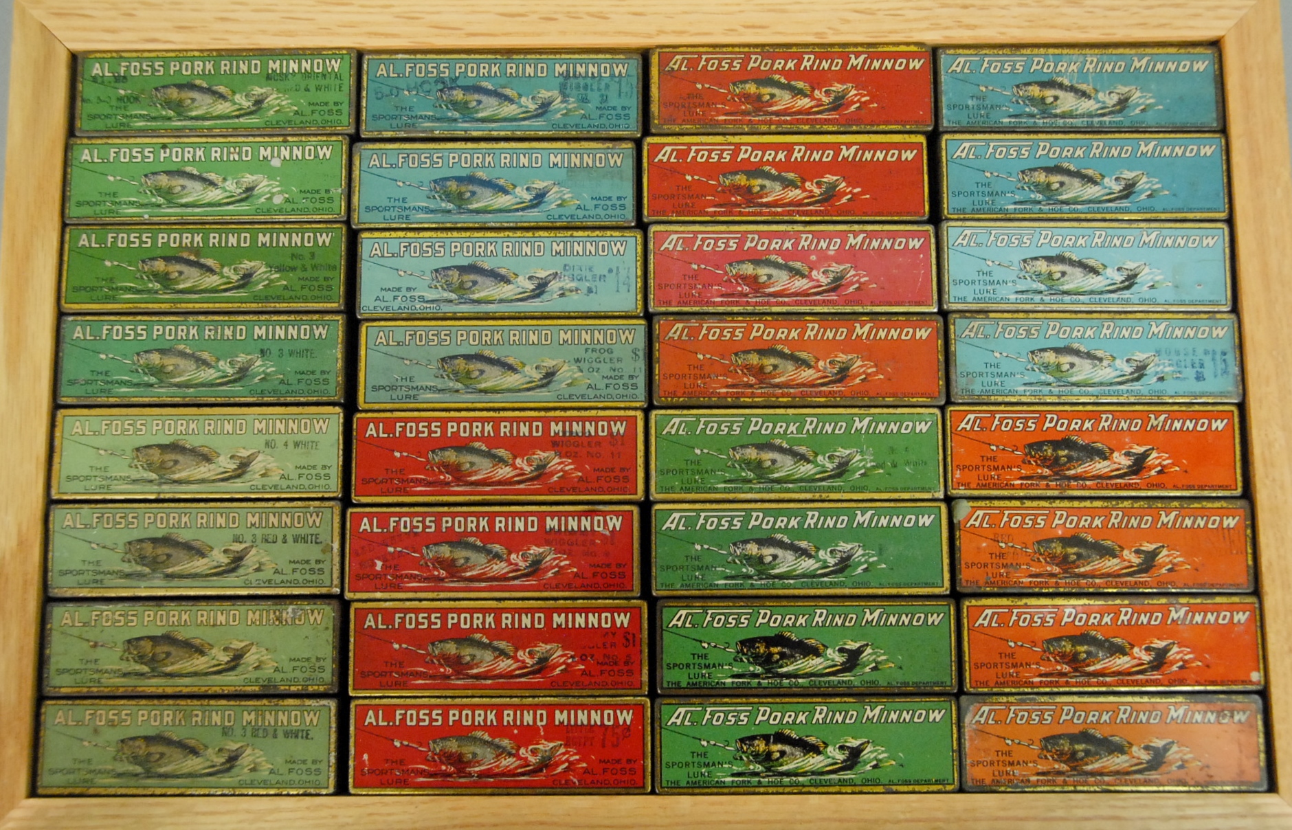 Thirty-two Al Foss Pork Rind Minnow original boxes for Musky Oriental, Wiggler, Little Egypt, Shimmy Wiggler, Frog Wiggler, Dixie Wiggler, Mouse Wiggler, etc.