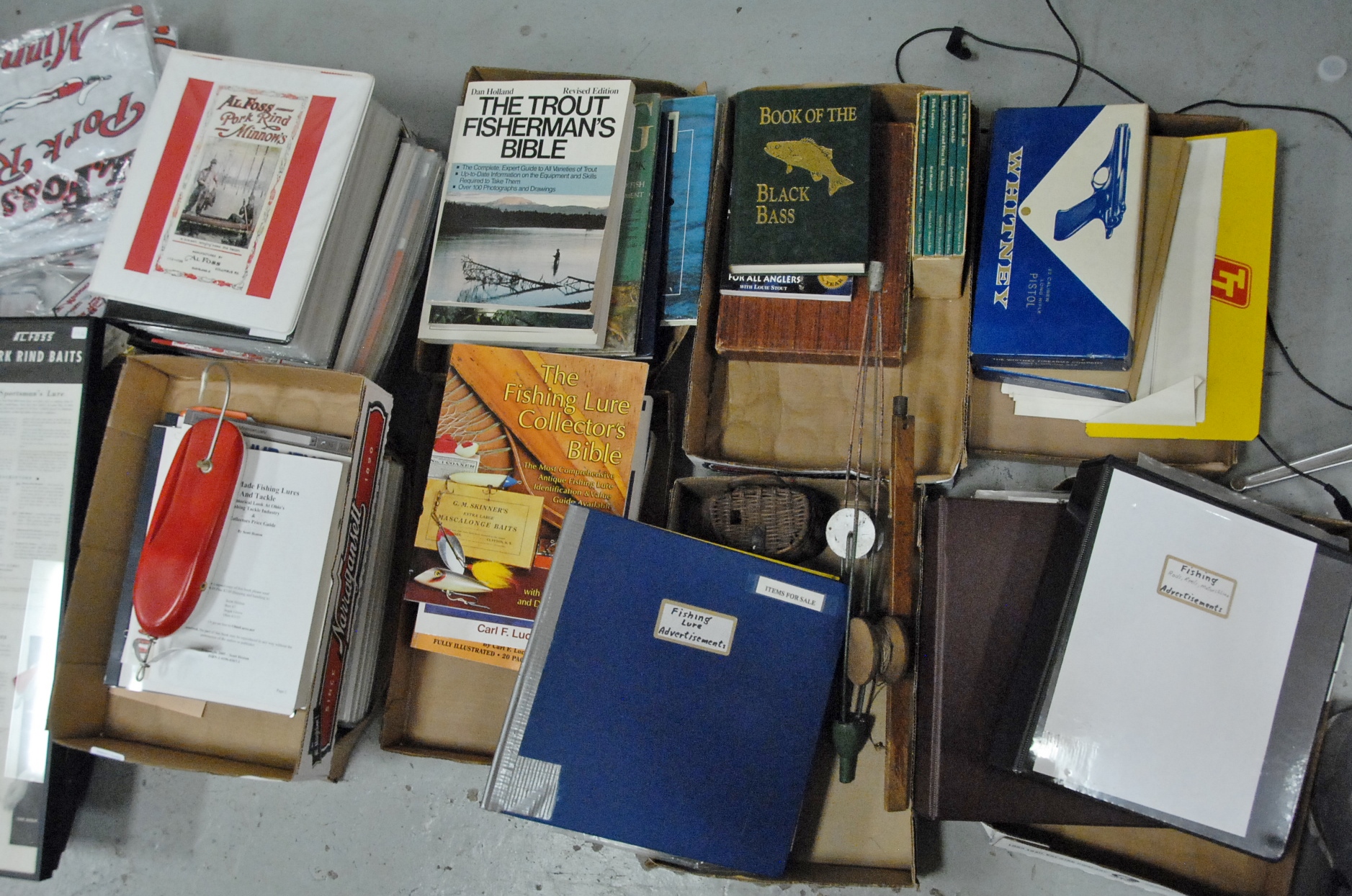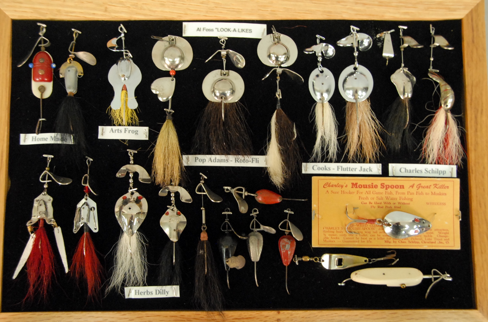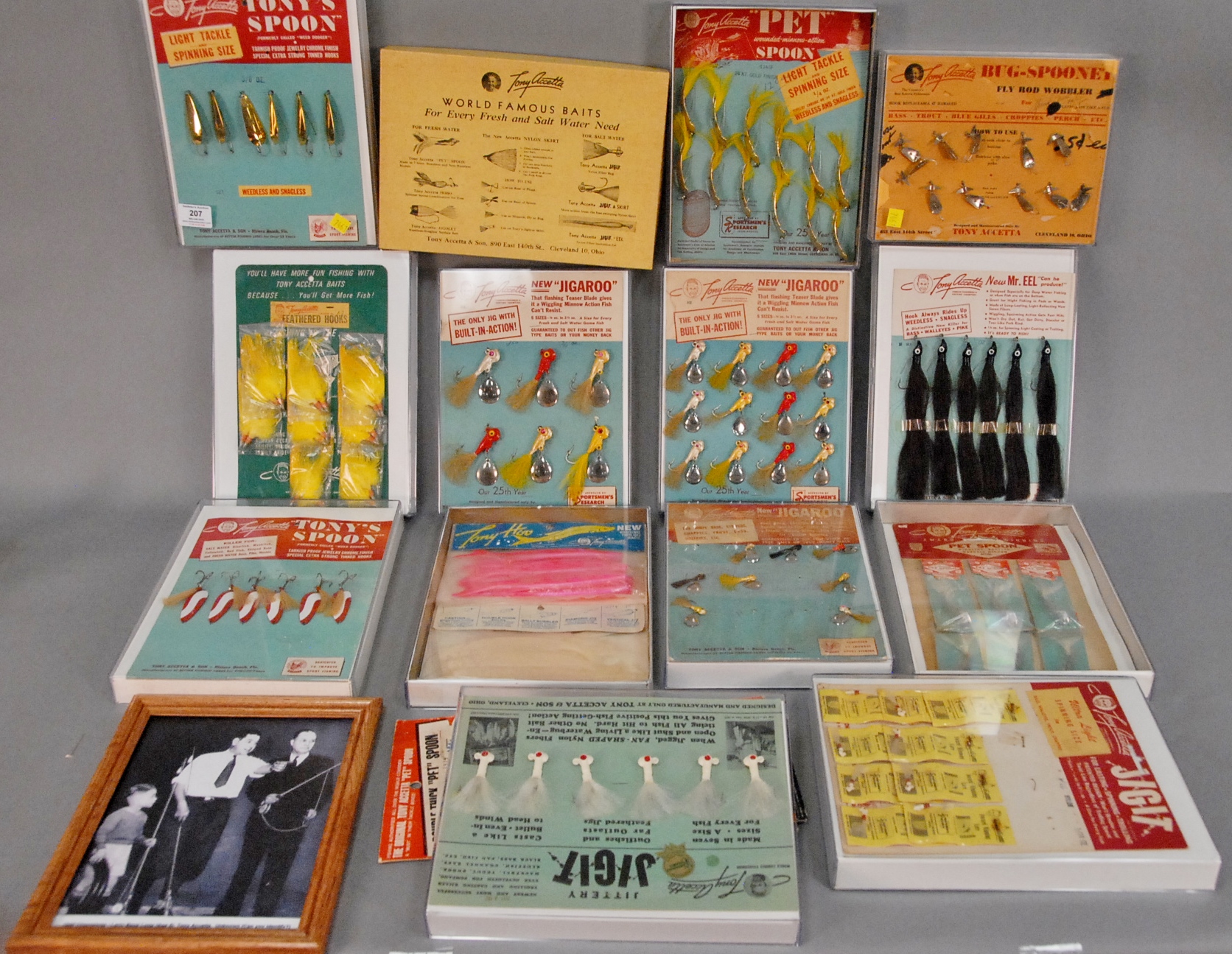 Tony Accetta eighteen piece lot to include Tony’s Spoon lures, Jittery Jigit, Feathered Hooks, Mr. Eel, Tony hoo, Bug-Spoonet, Pet Spoon, Jigaroo, and miscellaneous box of World Famous Baits.