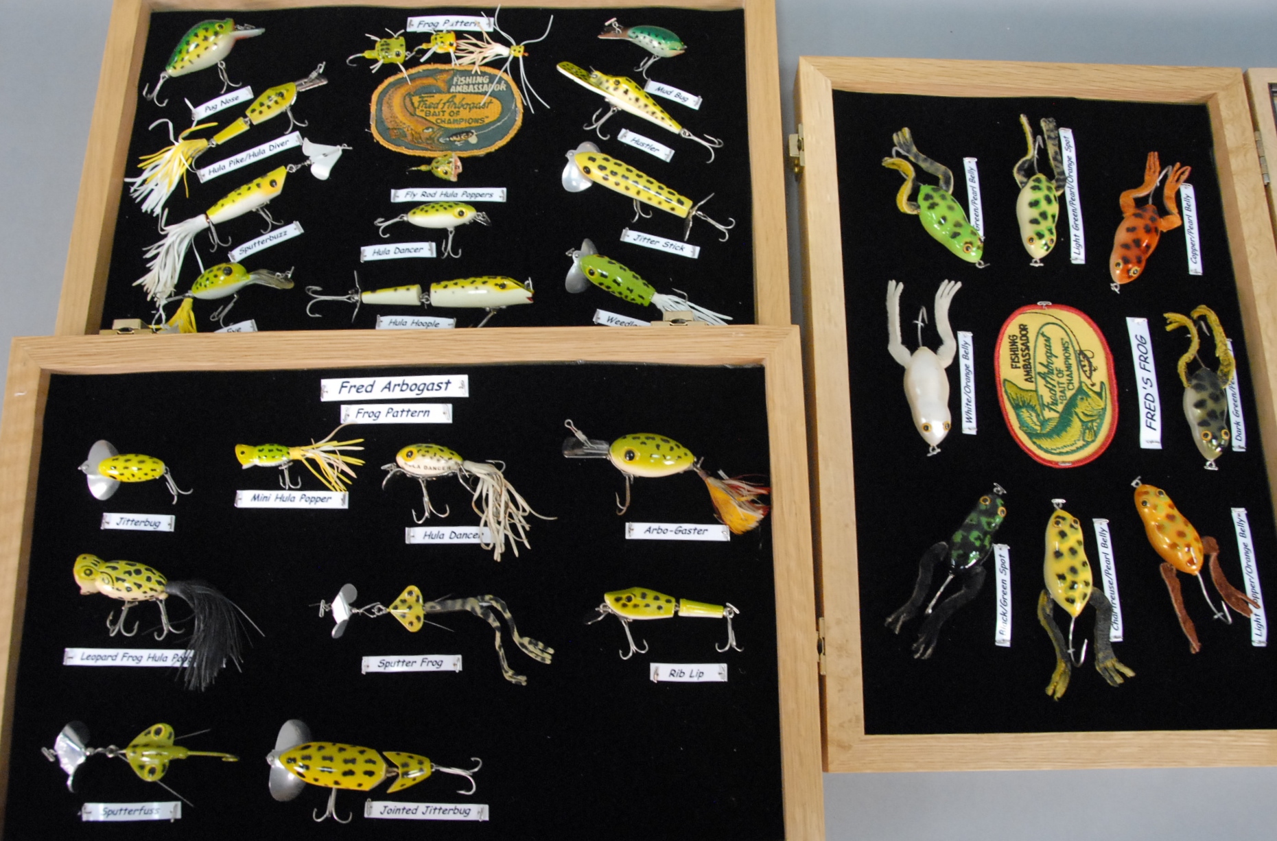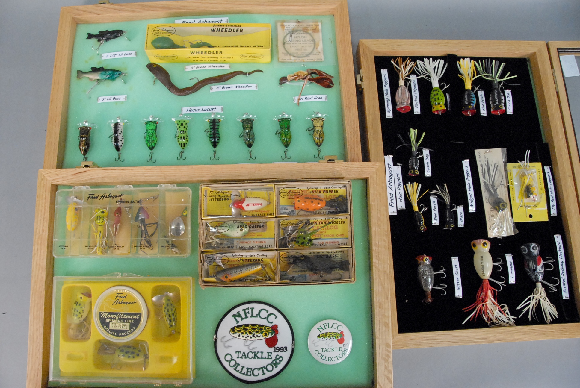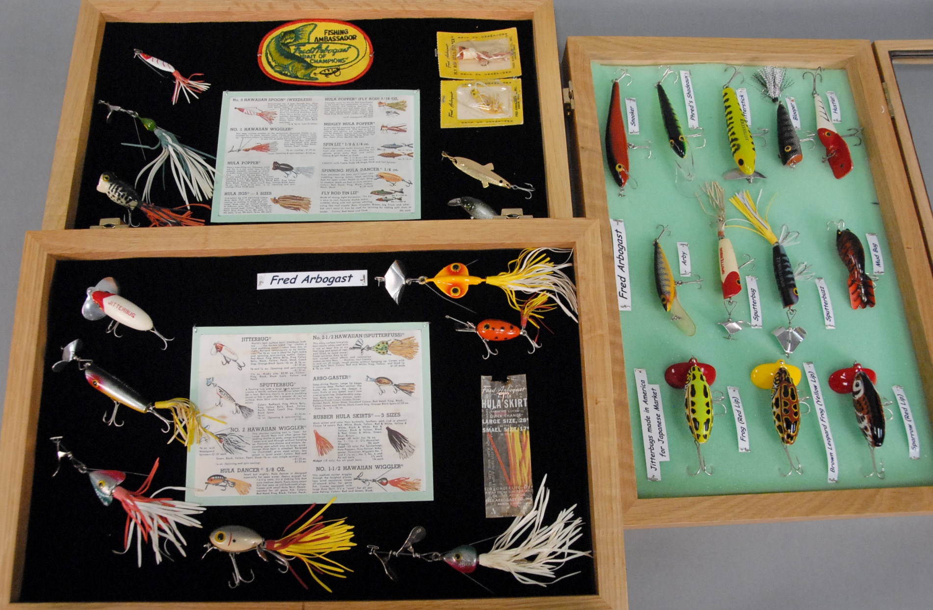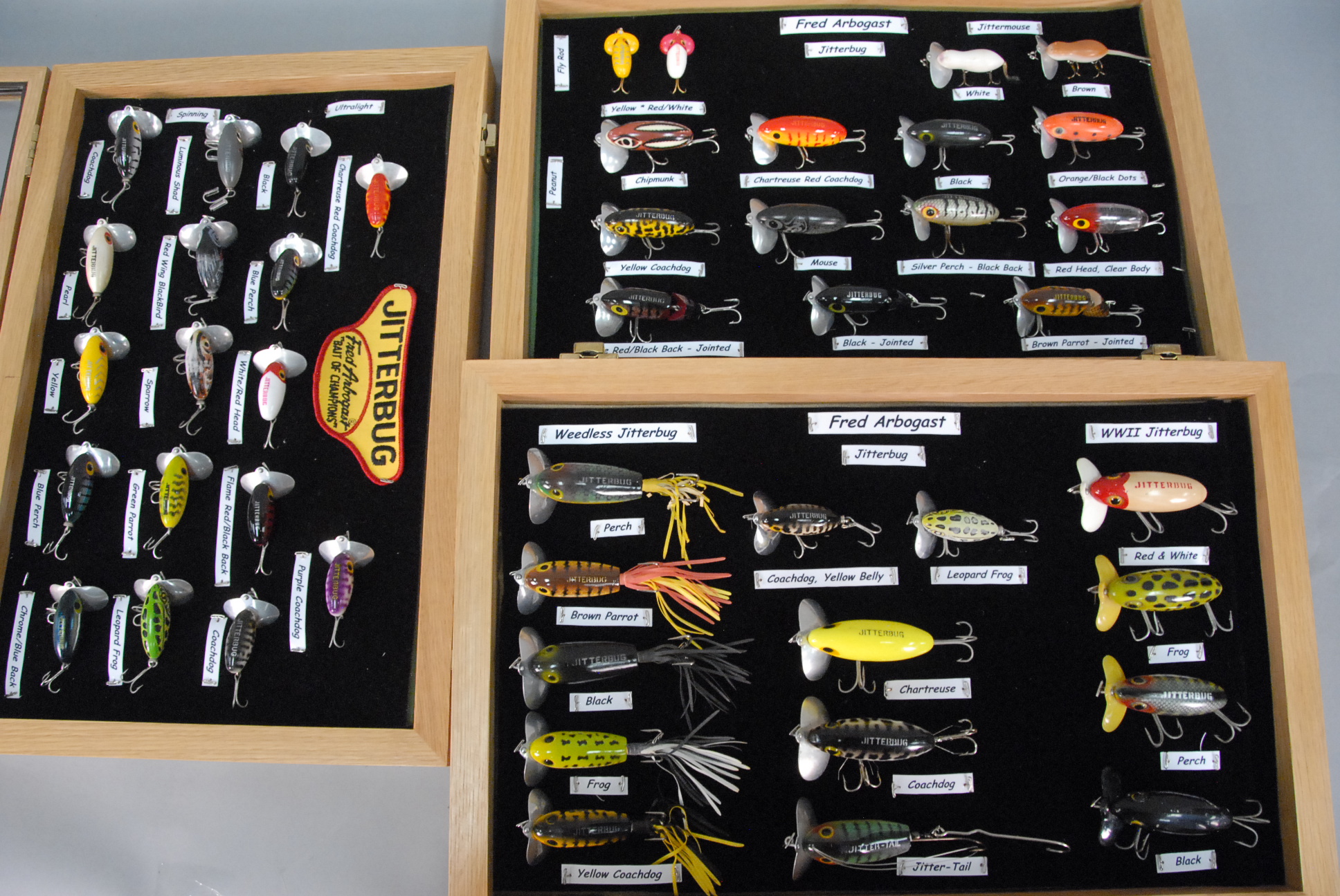 Fred Arbogast twenty-nine pieces in three cases to include twelve Jitterbugs made for Japanese market, Hawaiian spoon, Hula Jays, poppers, Spin Liz, etc.