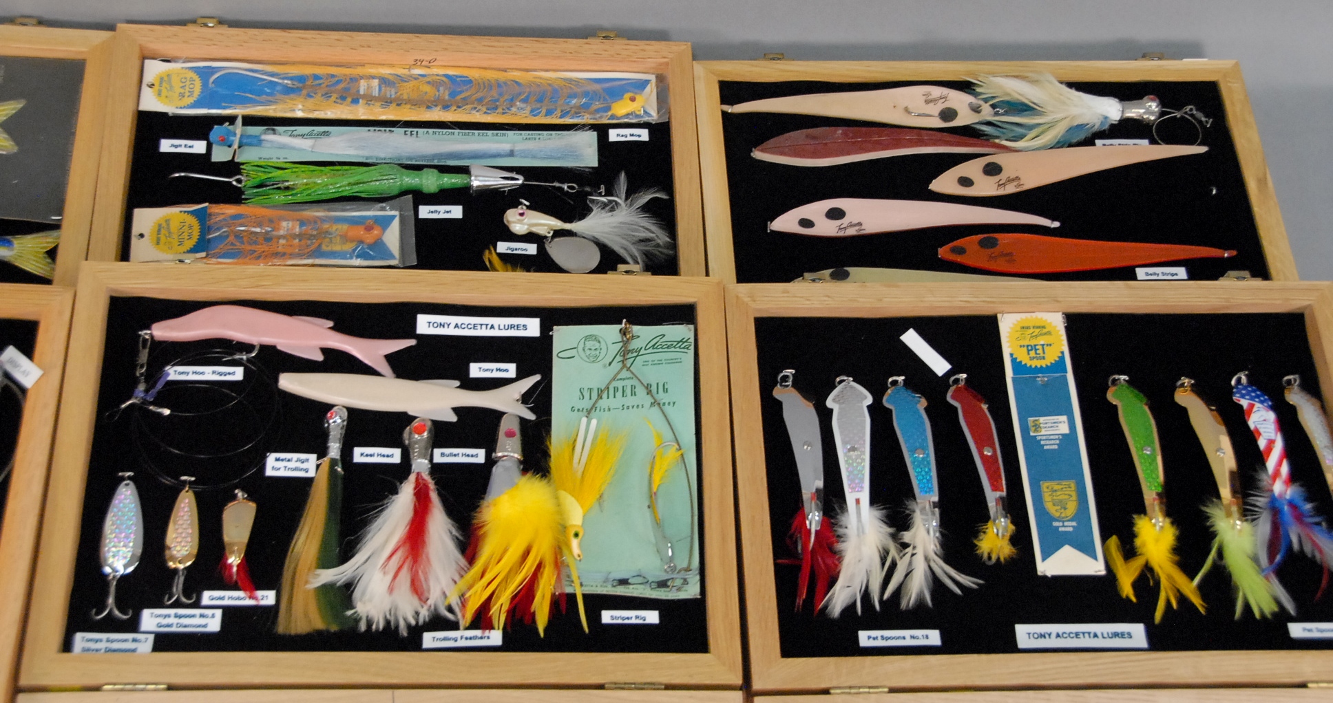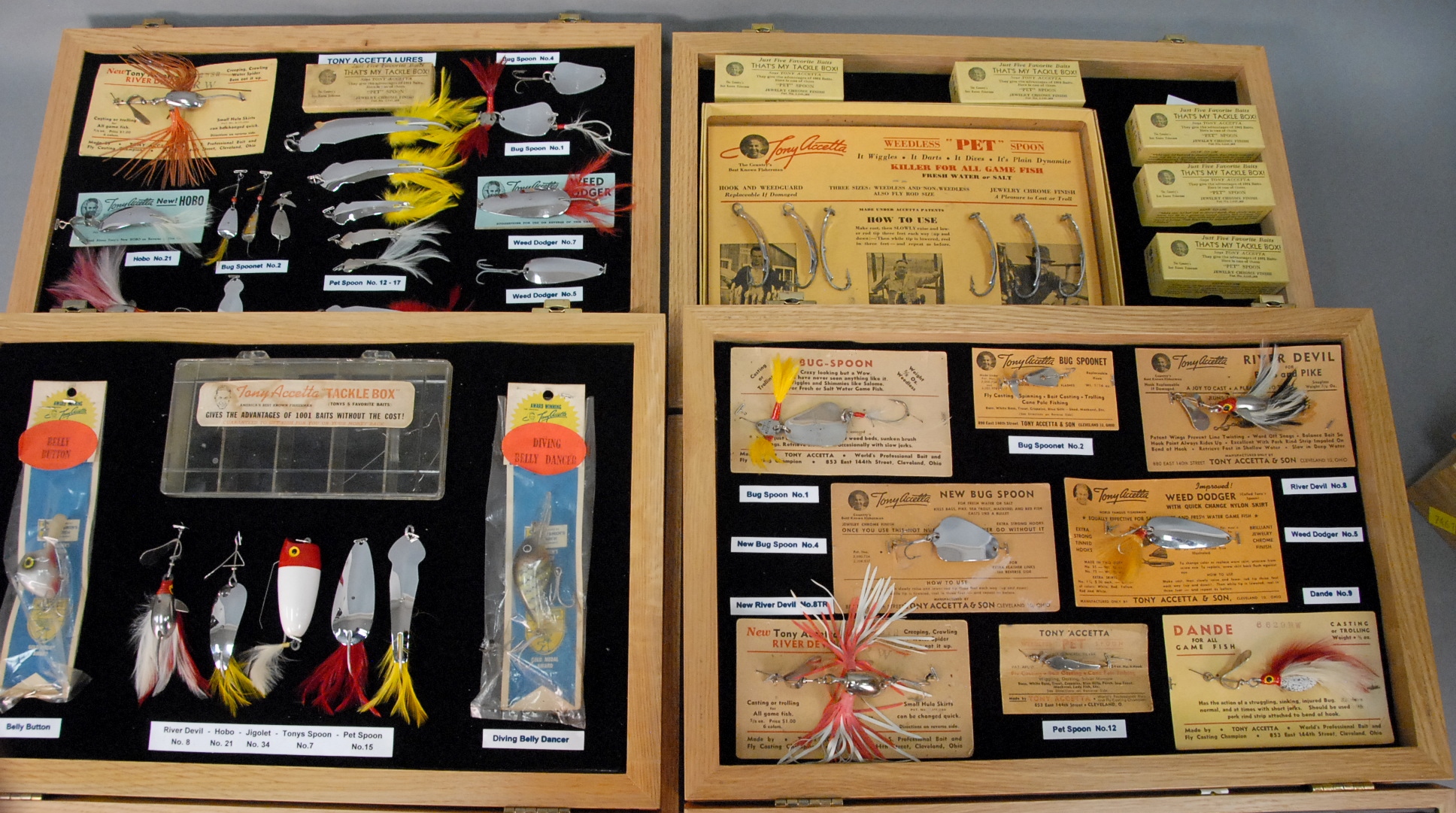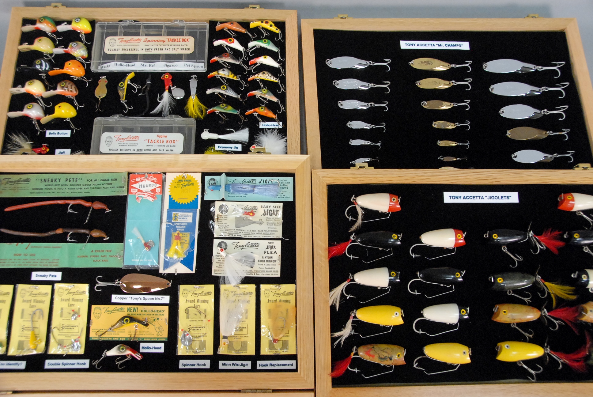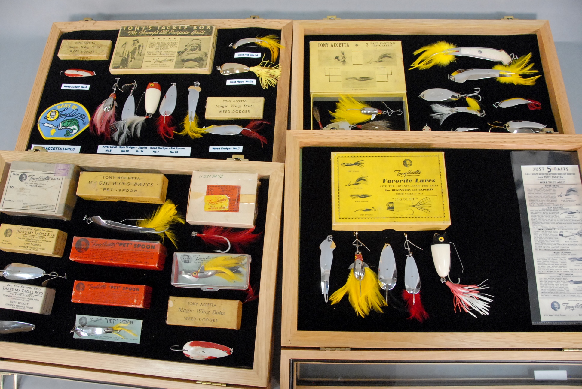 Tony Accetta group of four display cases with Tony’s tackle box, Magic Wing baits, Weed- Dodgers, Pet Spoons, Favorite Lures with box and Bait Casting favorites, etc., most with boxes.