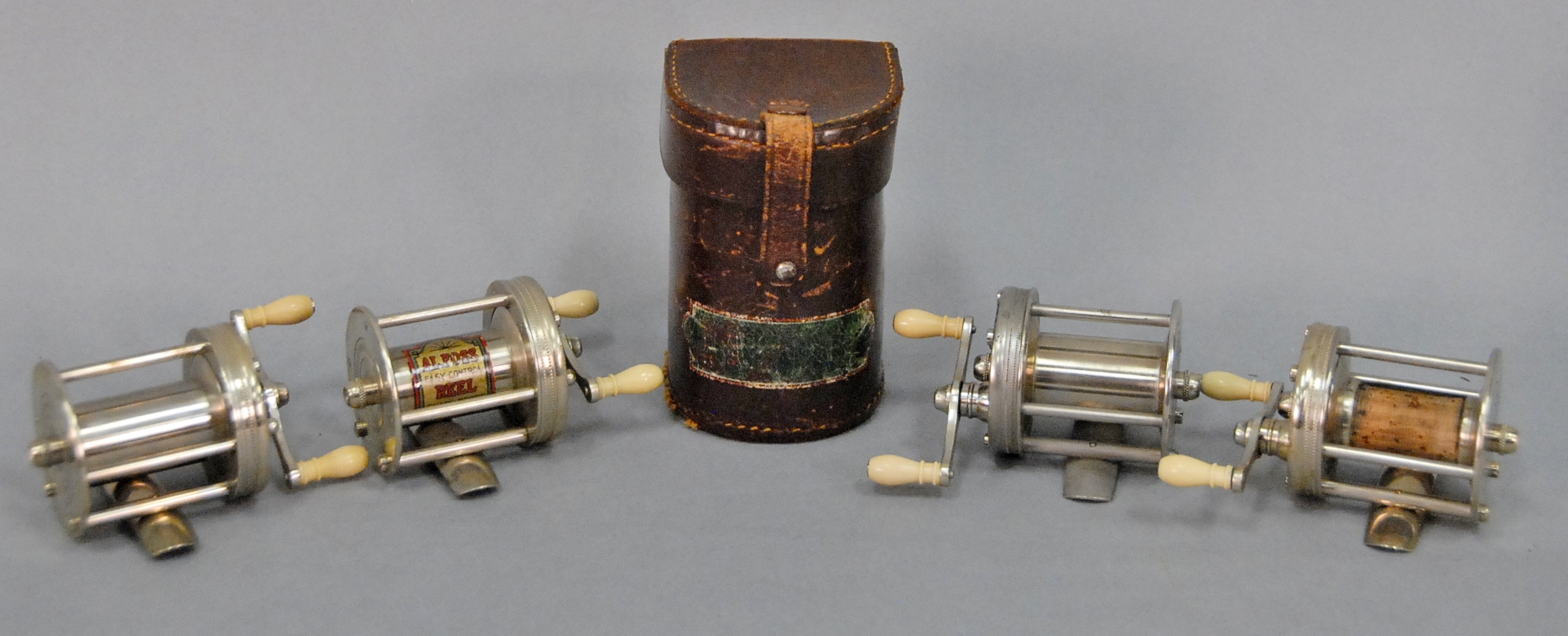 Four Al Foss German silver Easy Control tournament casting reels including one with cork spool, one with original paper label, and other two in excellent condition, one original leather case, all in an oak glass showcase.