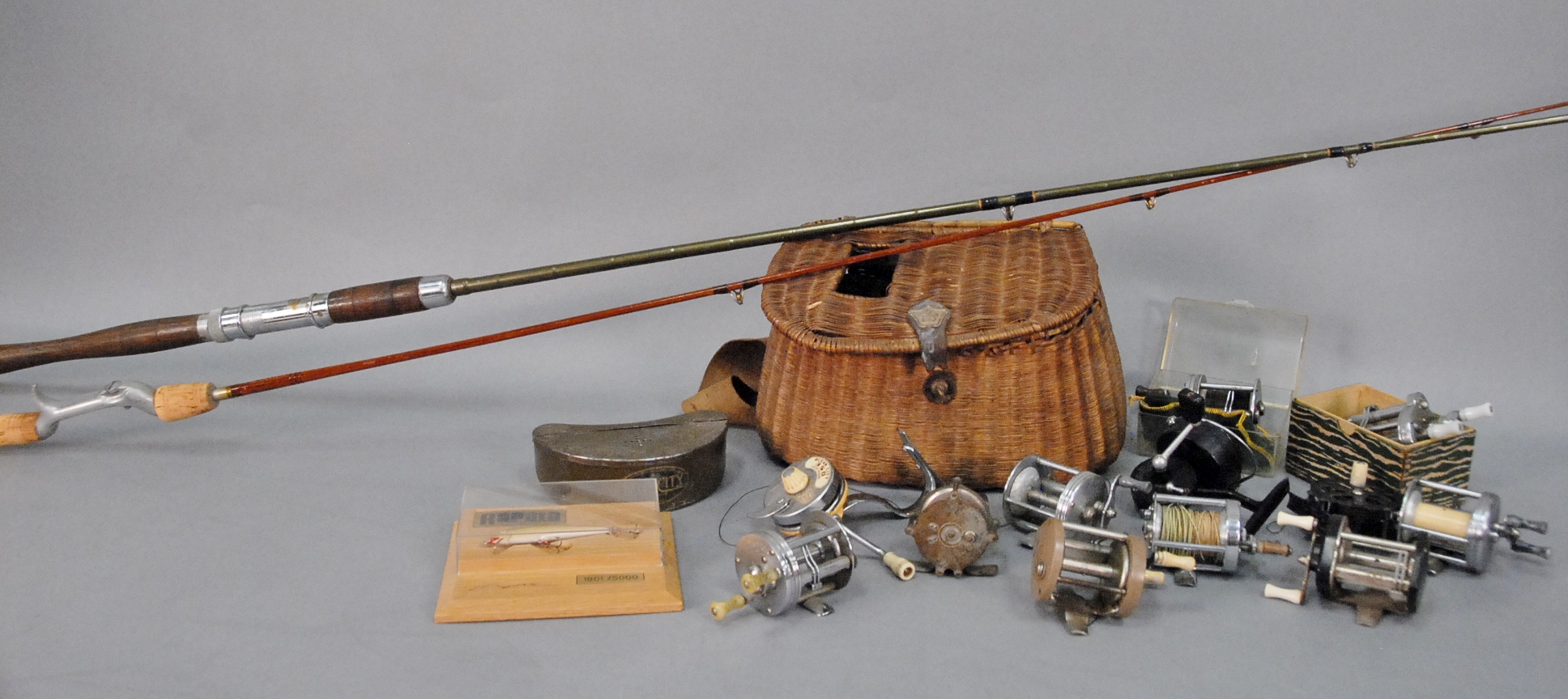 Group of reels including two Shakespeare Wondereel 1920, Ocean City 350, two Bronson Mercury 2550, Fly reel, Ocean City 1581, Mitchell 1304, Pflueger Summit with box 1983, Pflueger 1893L fishing creel, Fork Hoe #65 rod, and Shakespeare Tony Accetta model bamboo rod.